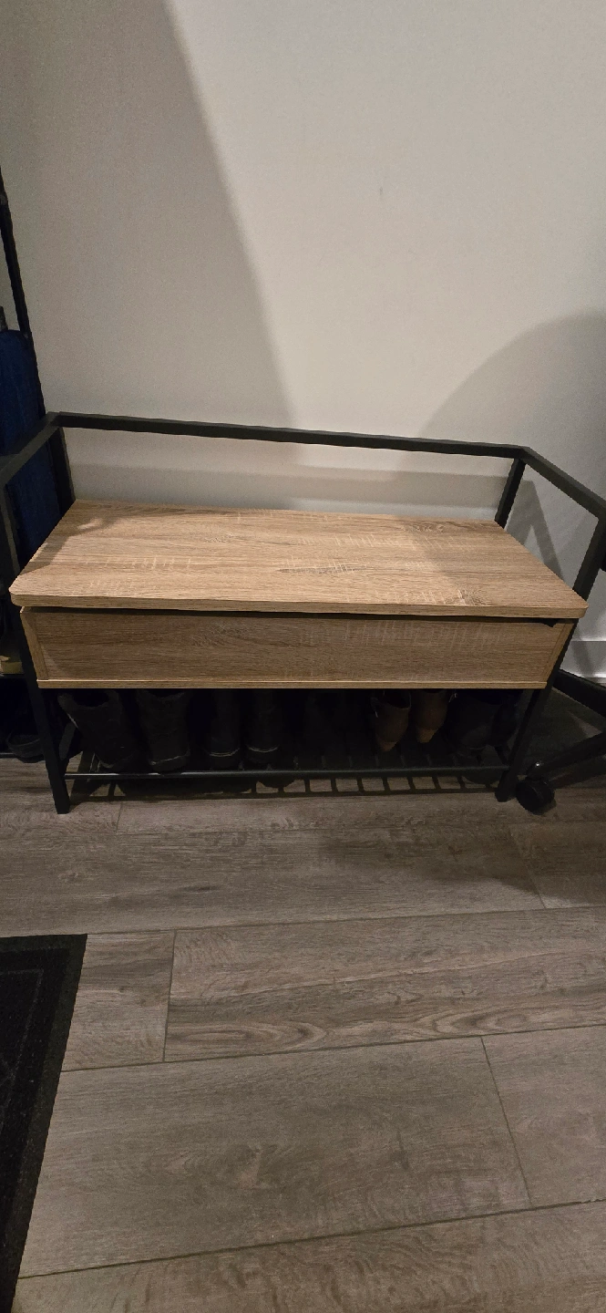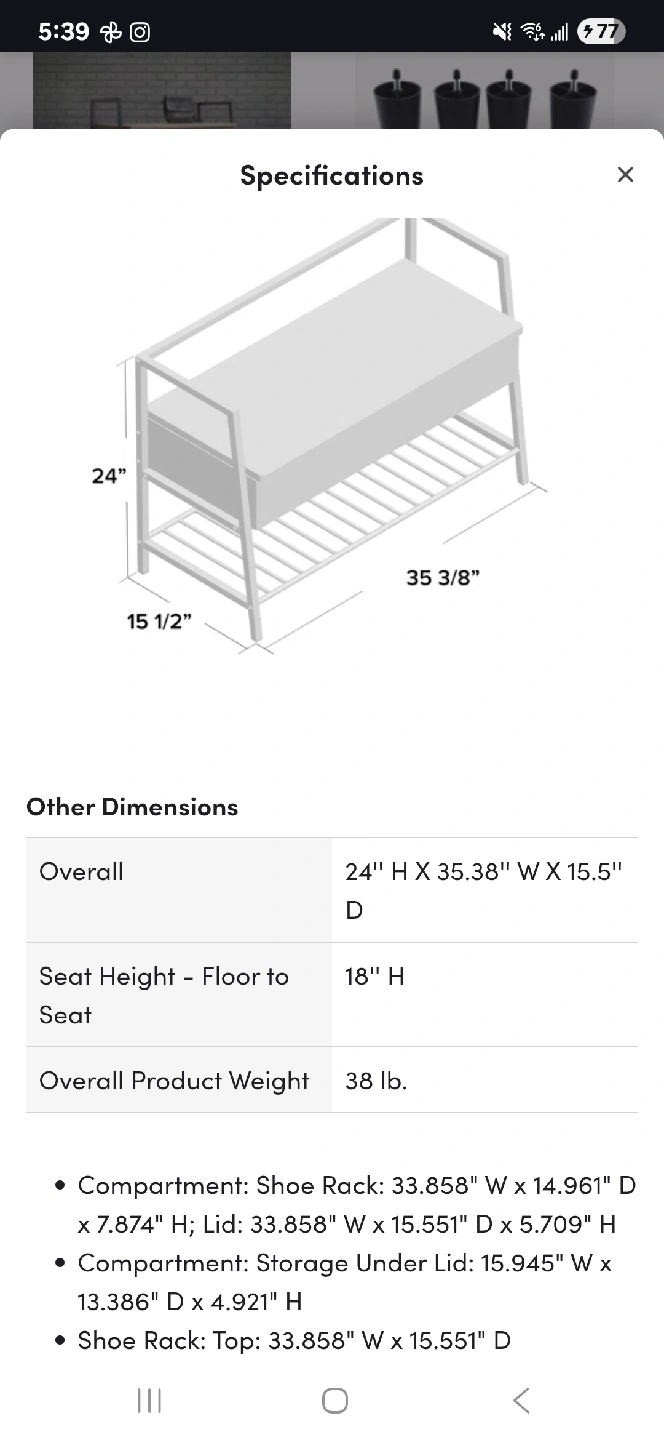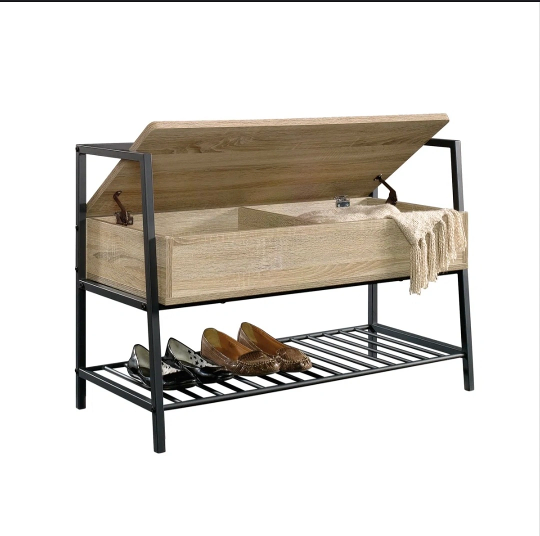 10This shoe storage bench with storage is perfect for keeping your entryway organized! It features a wood-look top and a sturdy metal frame. Color is Charter Oak. The dimensions are 24" H x 35.38" W x 15.5" D, with a seat height of 18". The overall product weight is 38 lb. The compartment for the shoe rack is 33.858" W x 14.961" D x 7.874" H. The storage under the lid is 15.945" W x 13.386" D x 4.921" H. The shoe rack top measures 33.858" W x 15.551" D