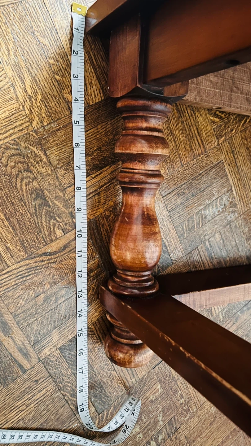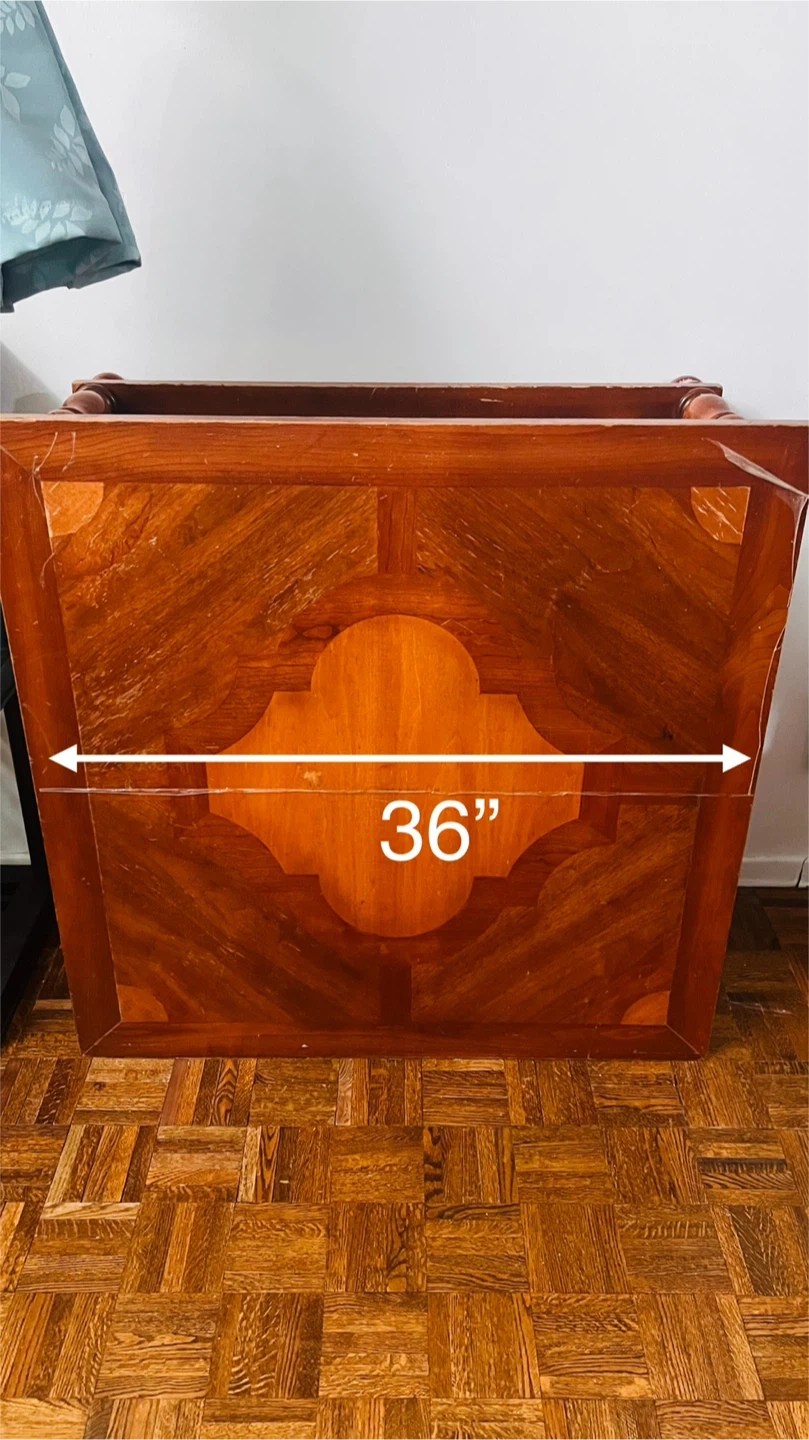 Here's a lovely wood centre coffee table looking for a new home! It measures 36 inches square and stands about 16 inches tall. It's a beautiful piece that would add a touch of warmth to any room