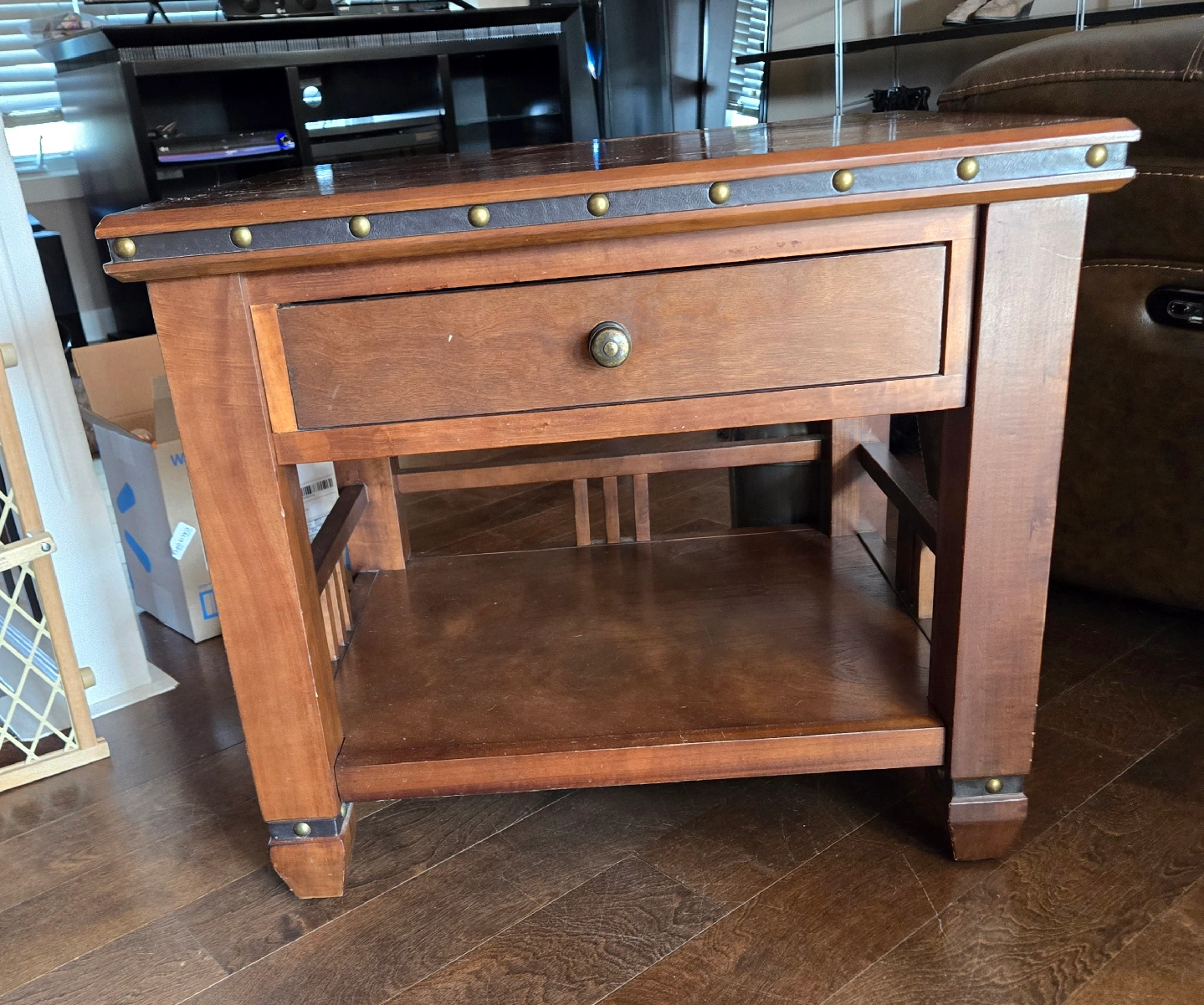 Okay condition. 28" wide, 24" depth and 24" tall. Heavy duty wood side table that would be great for any living room or bedroom. It features a drawer and a lower shelf for storage. Signs of wear as is from the 90's. Can use as is or restore. Well built and will last a lifetime. Drawer slides perfectly. Will need one very strong person or 2 people to lift. Matching end table and lift top coffee table under seperate posts. Cross-posted. 💥If you have a moment please have a look at my other items for sale.