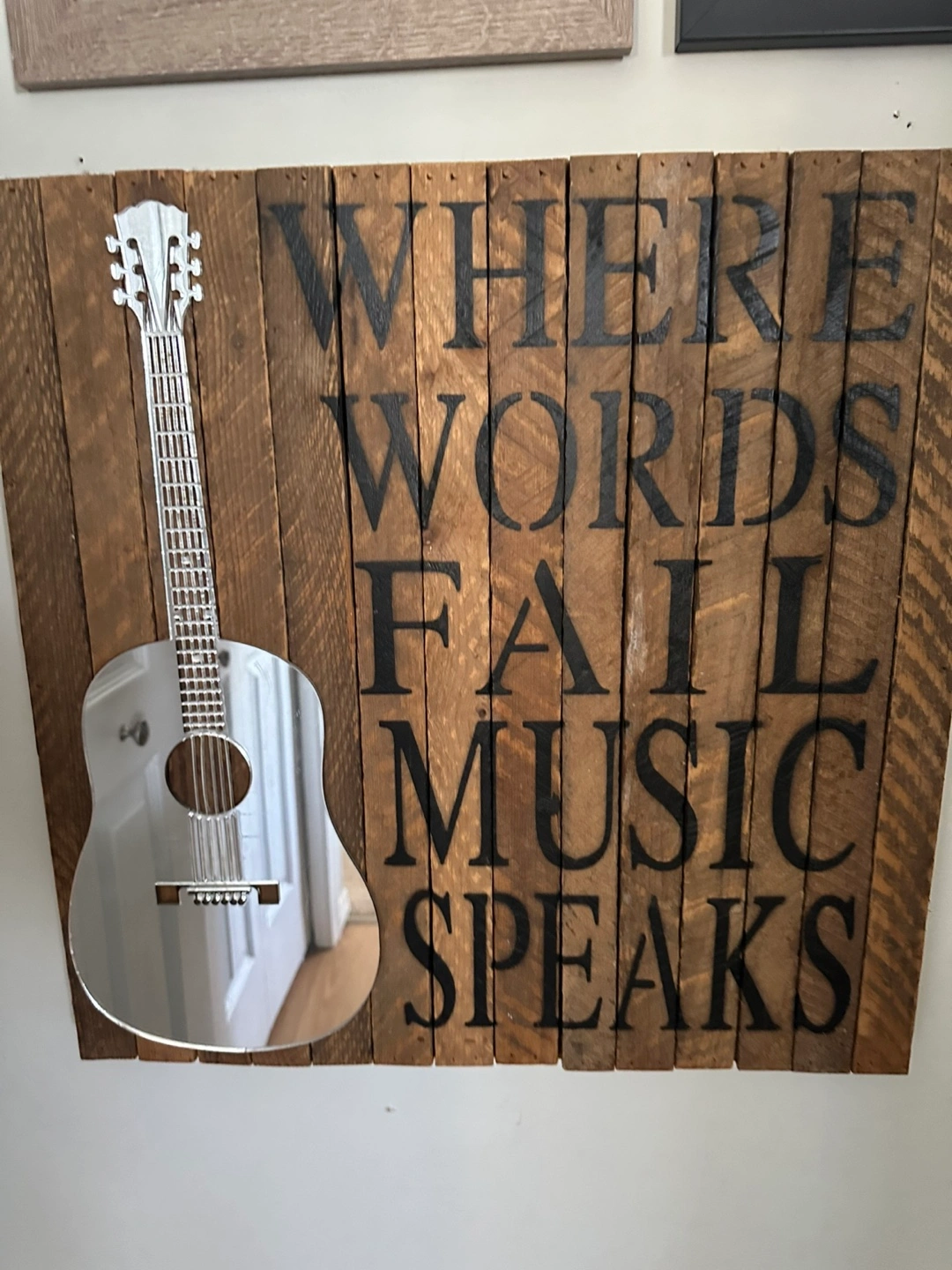 97Rustic wooden pallet sign featuring a mirrored acoustic guitar. Words "Where words fail music speaks" painted on the wood. Unique home décor piece.