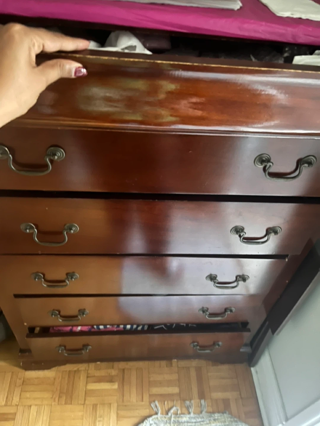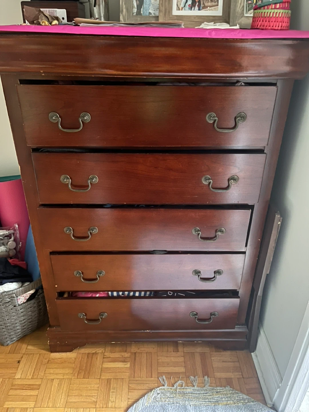 32Selling a wooden 5-drawer dresser. With a top velvet red drawer for jewellery and documents. It's a nice piece of furniture with a classic look. Perfect for adding storage to any room! Lots of storage, with visual appeal.