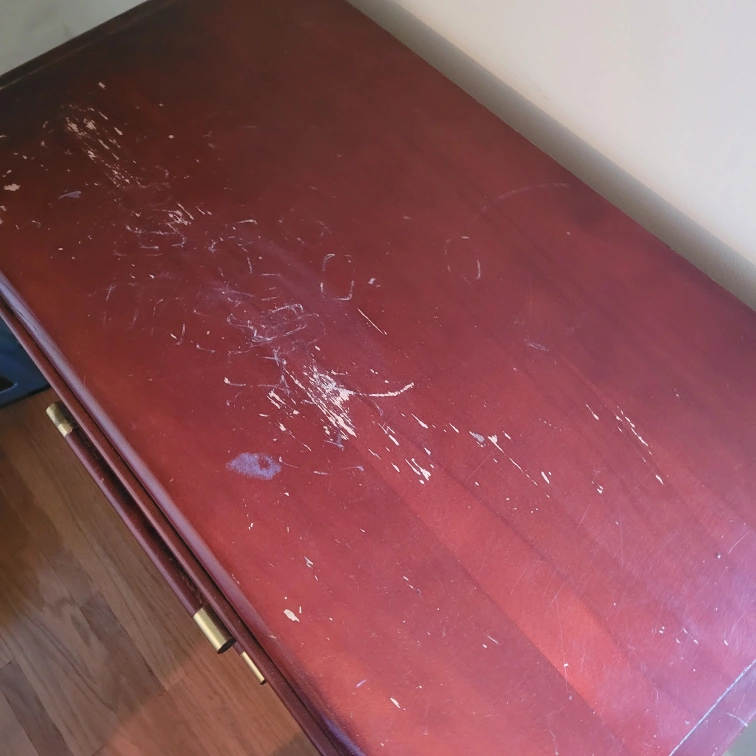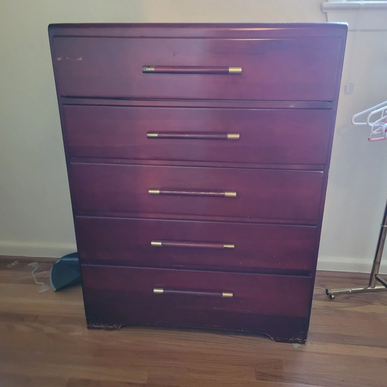 Selling a wooden 5-drawer dresser in a burgundy colour. It has some scratches on the top surface, as shown in the pictures. Great for extra storage in a bedroom or living area!