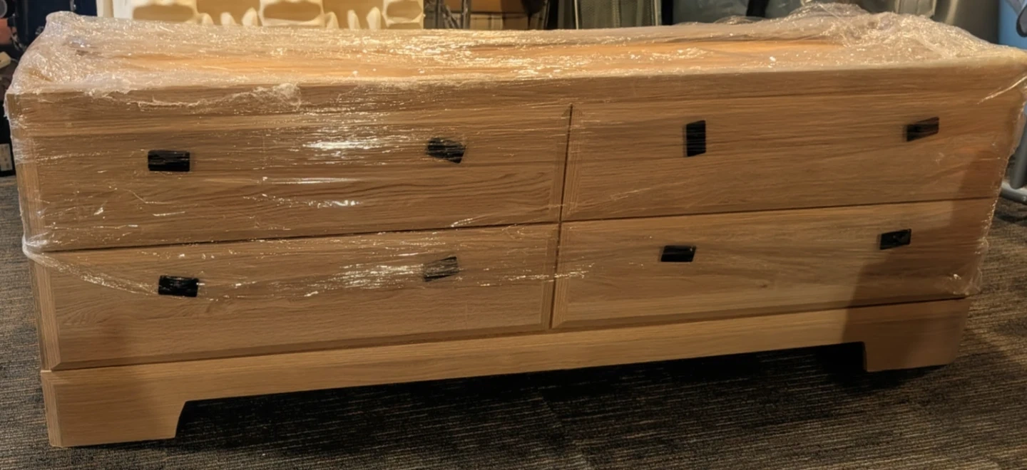 20Selling a wooden dresser with 4 drawers. It's wrapped in plastic for protection. Perfect for adding storage to any bedroom! Or can be used as a front door seat and shoe storage. If using as a door, ottoman seat cushion is required