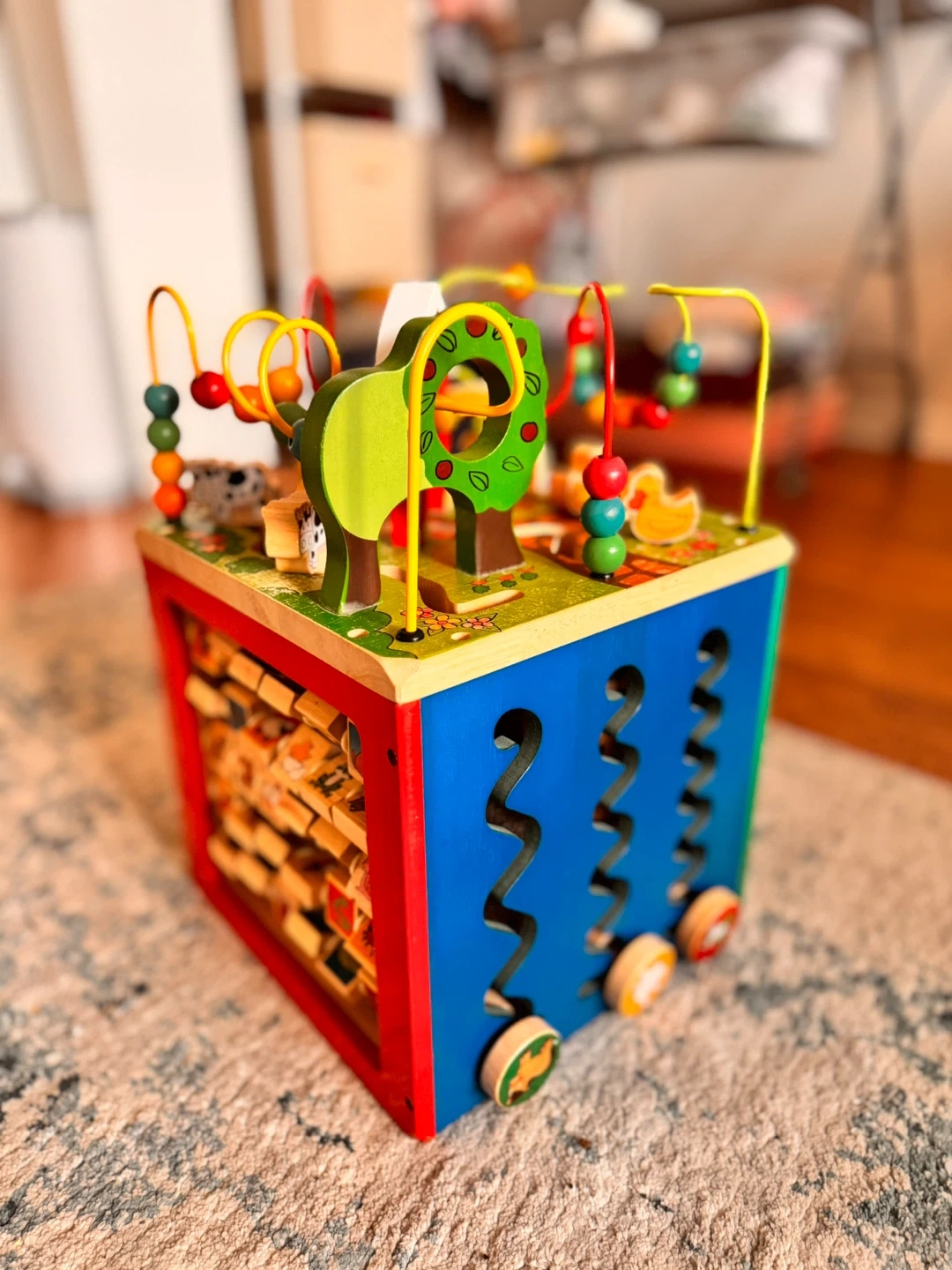 37This wooden activity cube is a great toy for toddlers! It features a variety of activities on each side, including bead mazes, shape sorters, and spinning gears. Brightly coloured and engaging, it's sure to keep your little one entertained while developing their fine motor skills and problem-solving abilities