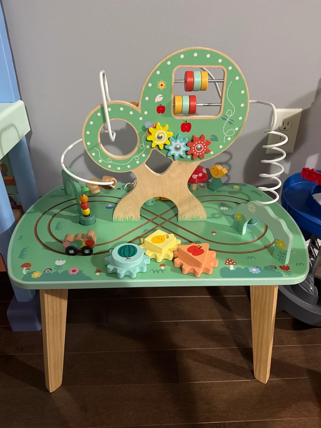 10This is a super cute wooden activity table! It features a tree design with colourful gears and a bead maze. Great for toddlers to develop their fine motor skills and have fun