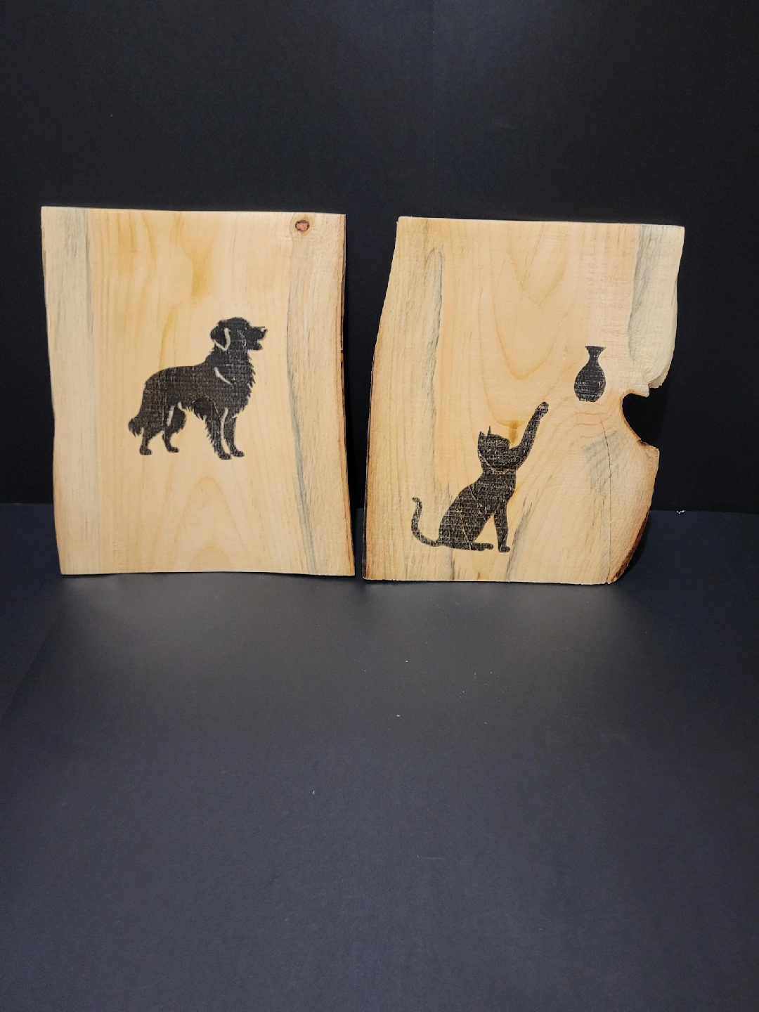 Selling wooden plaques/ decor pieces featuring animal silhouettes. One has a dog and the other has a cat. They are about 12 inches in height and 10 inches in width.