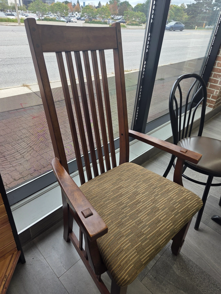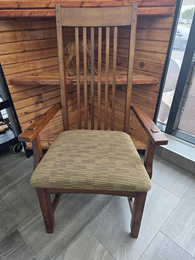 Here's a lovely wooden armchair with a patterned seat! It's a sturdy and stylish piece that would look great in any room. Perfect for adding a touch of classic charm to your home for ( each $150)