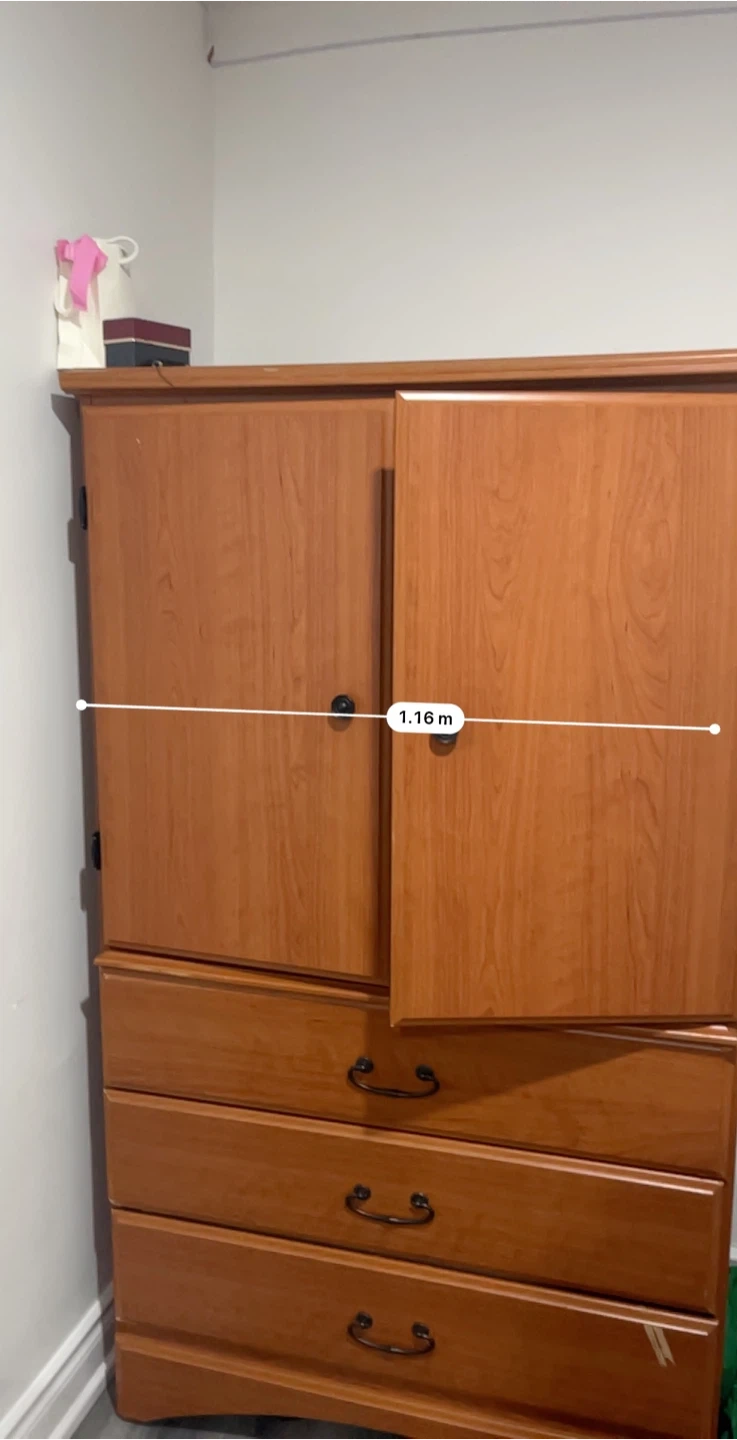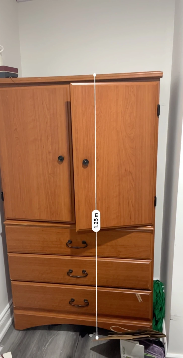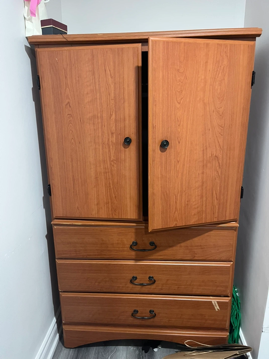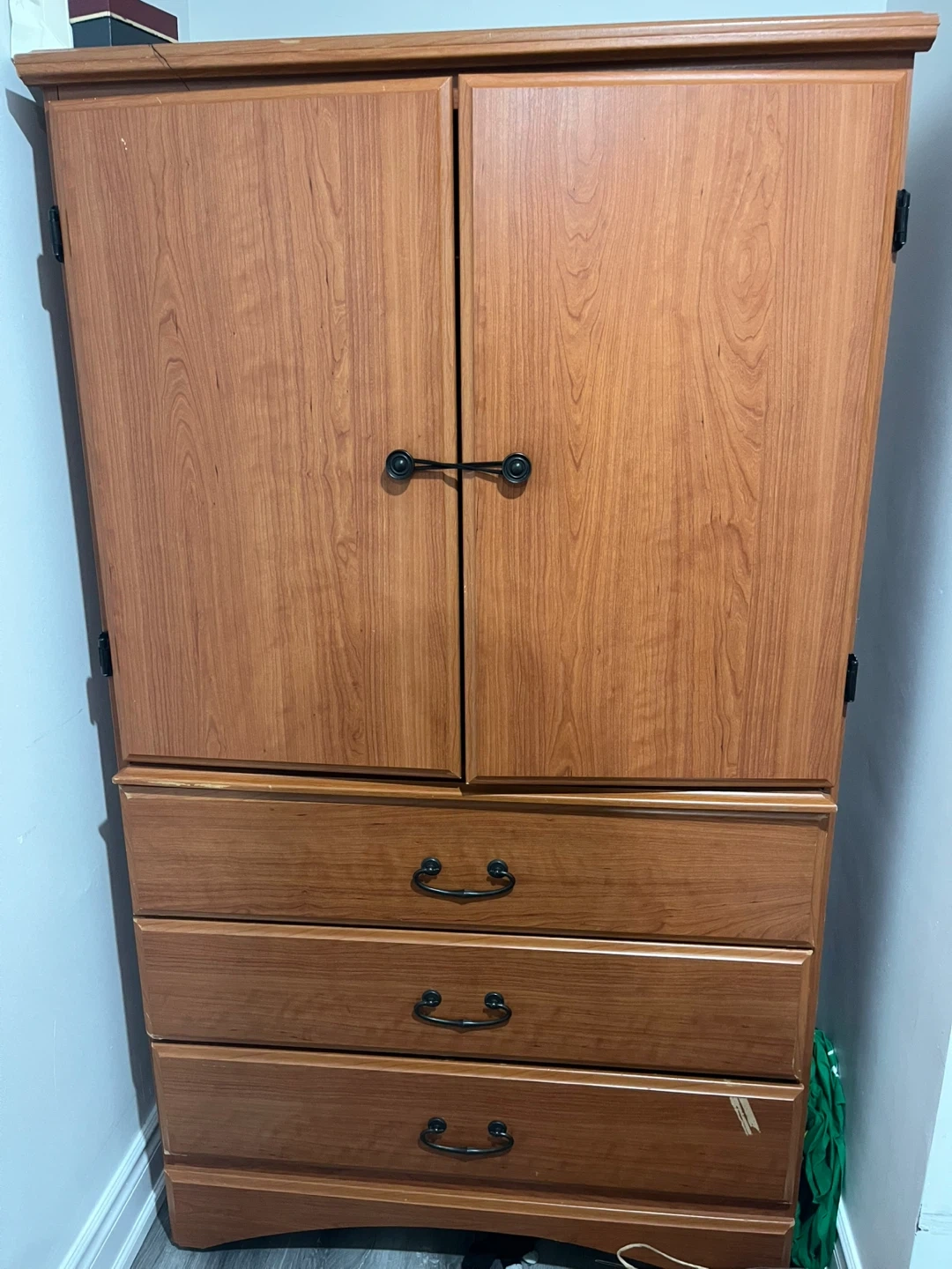 Selling a wooden armoire with three drawers at the bottom and a cabinet on top. It's in good condition and measures approximately 1.25m tall and 1.16m wide. Perfect for extra storage! It is heavy and the door on the top doesn’t shut completely but it is easy to fix. You can also use other alternatives to keep it shut.