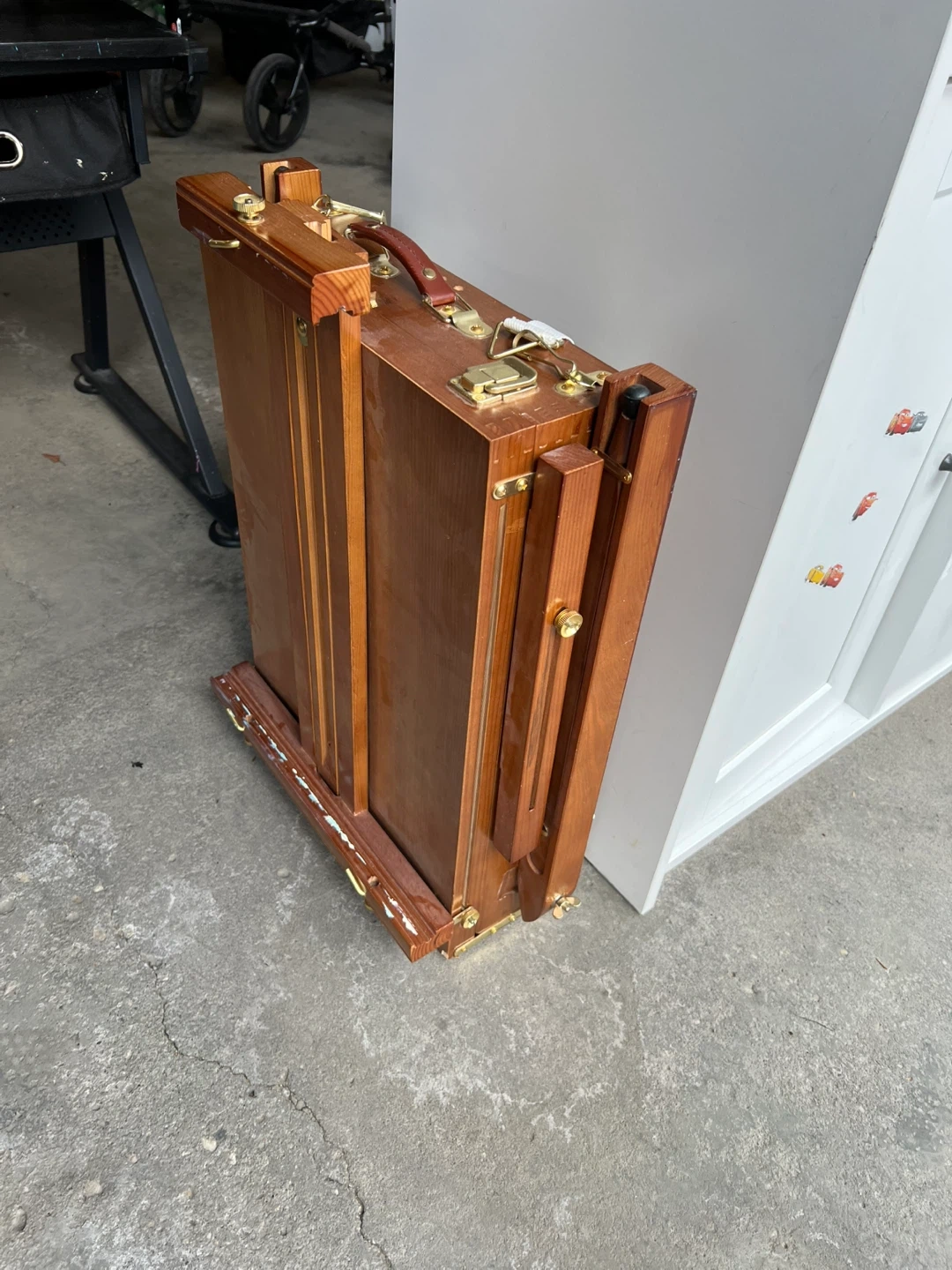 38Selling a well-maintained wooden art easel! It folds up for easy storage and transport. It also includes a storage compartment for your paints and art supplies. Perfect for artists of all levels! Small collection of paints included.
