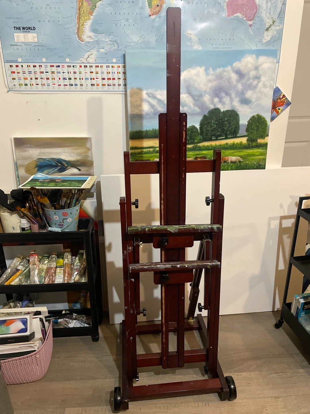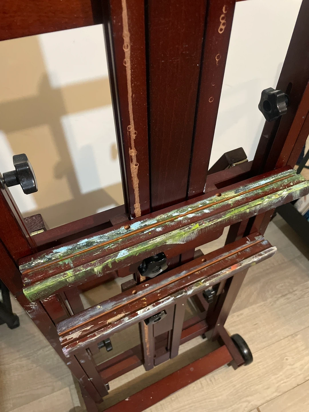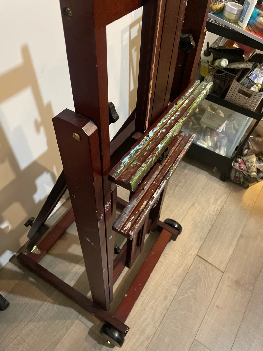 85Selling a wooden artist easel. It's in good condition and ready for your next masterpiece! It has some paint stains. Size: 1.70 CM*40 CM*50 CM