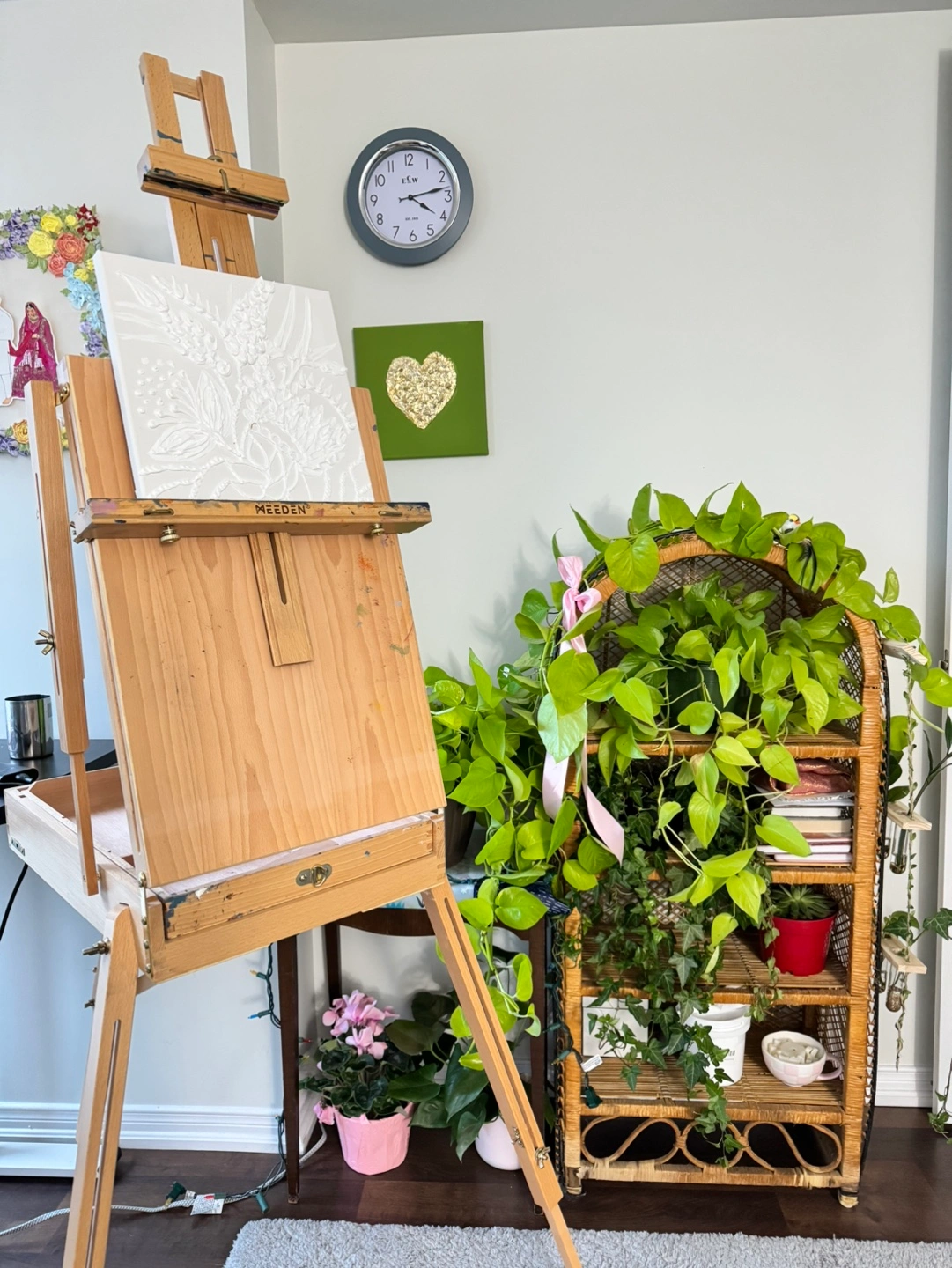 Wooden easel with metal hardware, featuring a Meeden brand label. Has some wear, but in good condition. Selling because moving