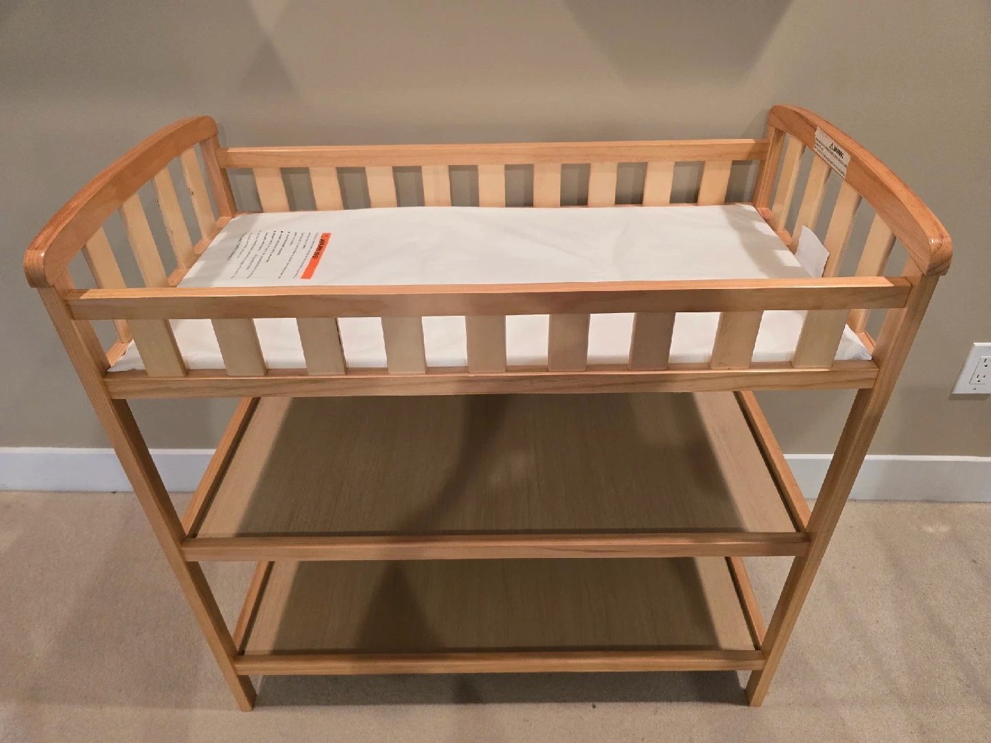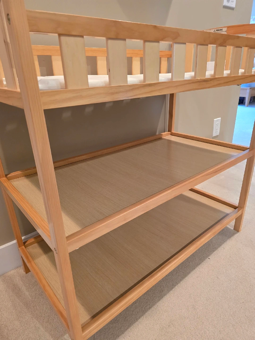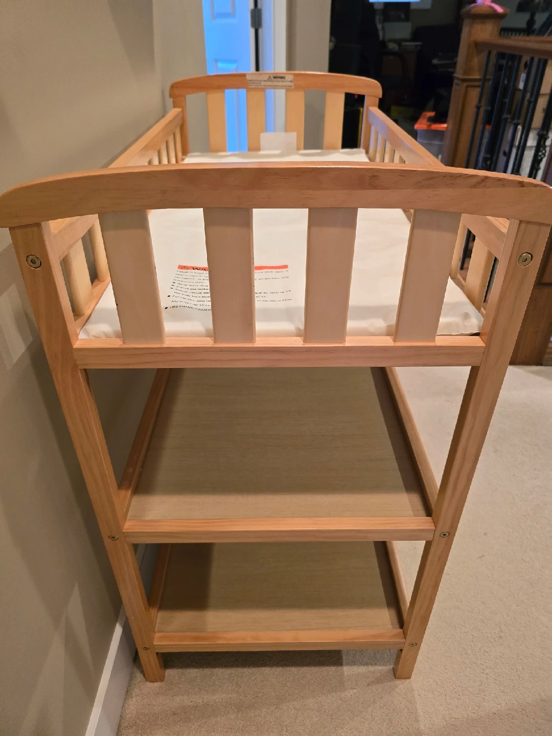 65Selling a gently used wooden baby changing table. It features a sturdy design with multiple shelves for convenient storage. Perfect for keeping baby essentials organized and within reach during diaper changes.