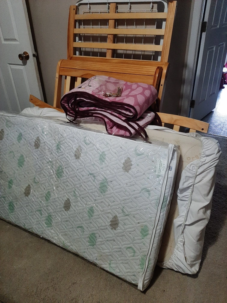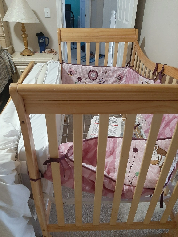 10Selling a gently used wooden baby crib. It comes with an organic mattress and a cute bumper. The crib is in good condition and ready for a new home! Perfect for your little one's nursery very slightly used no damages pick up chaparral se Pet and smoke free home asking price is $150