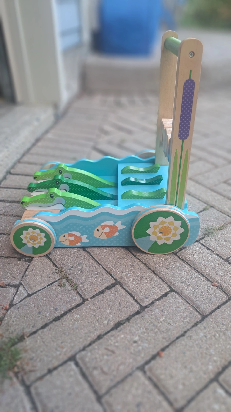 10This cute wooden baby walker is perfect for little ones learning to walk! It features a fun alligator design and provides support as they take their first steps.This is a Melissa and Doug baby toy.