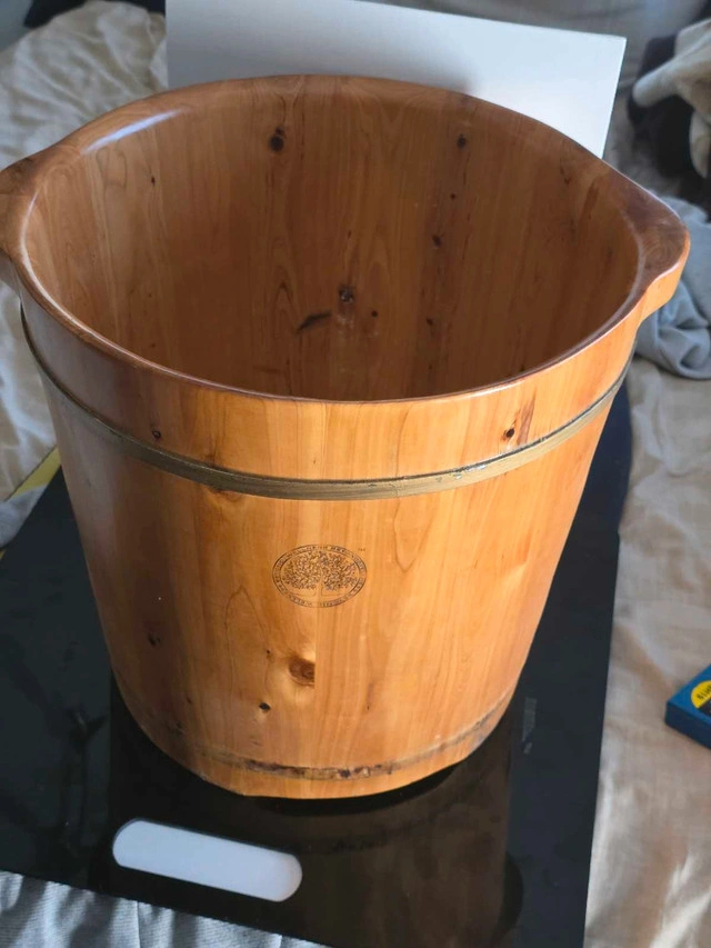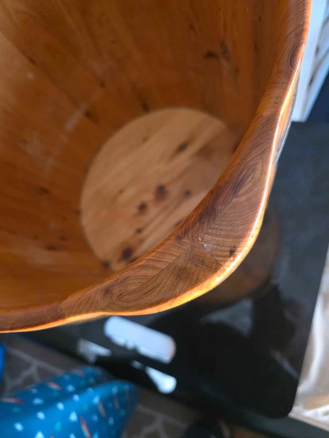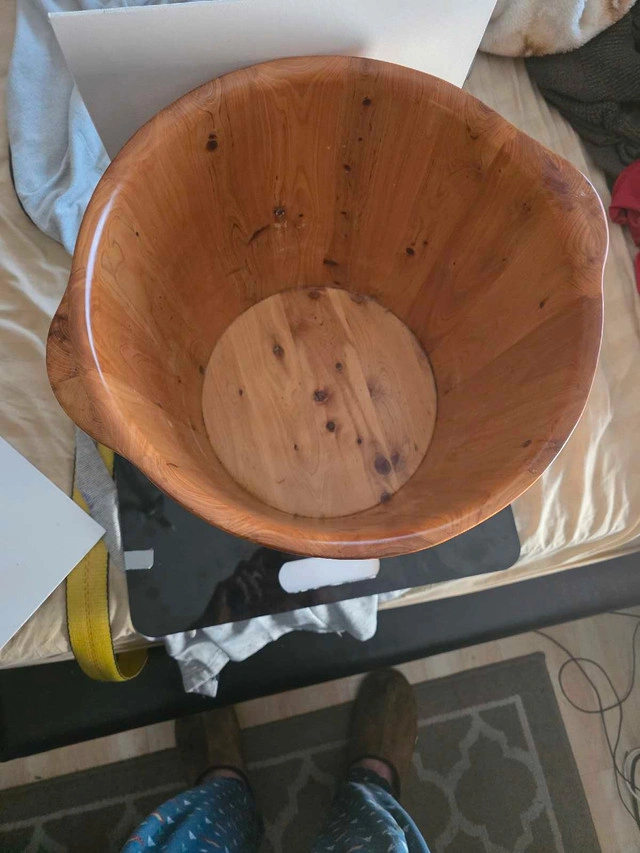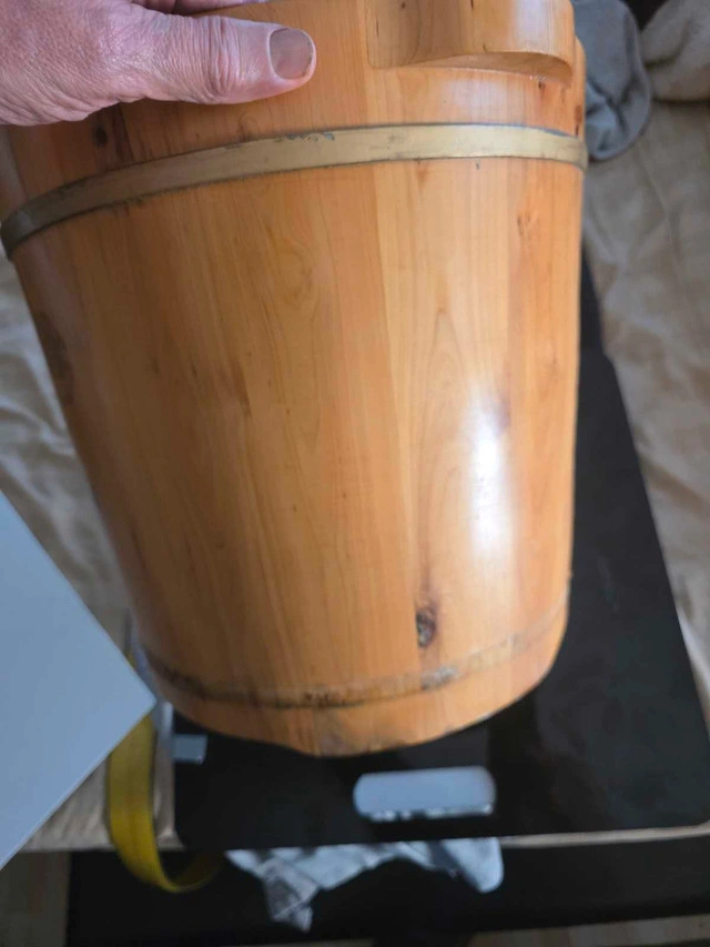 64This is a used wooden barrel with bamboo accents, measuring 14 x 14 inches. The barrel shows some signs of wear, which adds to its rustic charm. It's a high-end piece, perfect for decor or functional use. A unique find for any home! This barrel is a lovely piece. I see these retail between two and four hundred dollars normally. Perfect for multiple uses or just as design feature. If the advertisement is still up, the product is available!