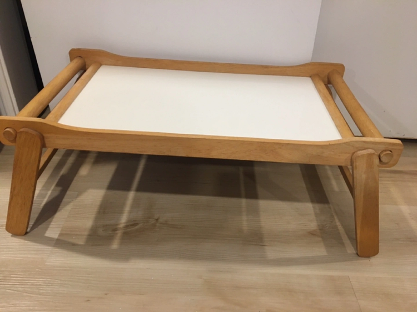 300Selling a wooden bed tray table. It's perfect for breakfast in bed or working from the couch! The tray features a light wood frame with a white top surface.