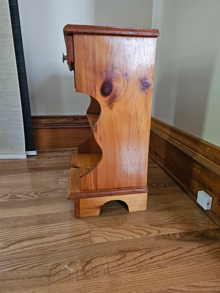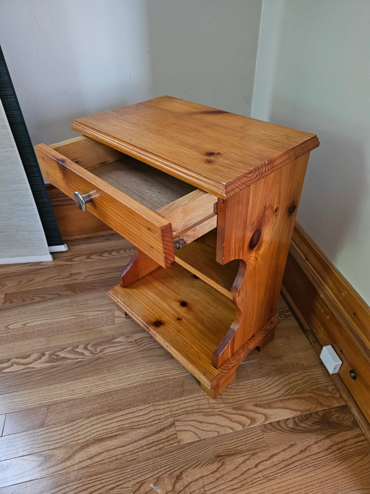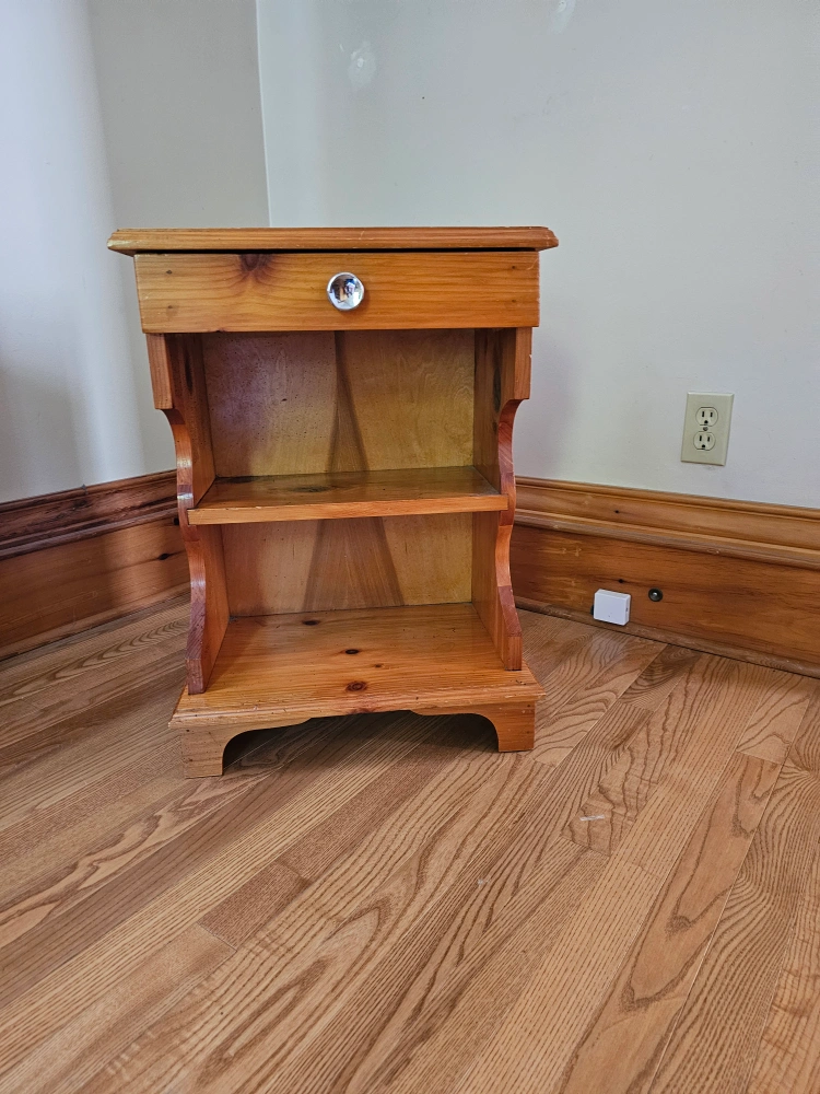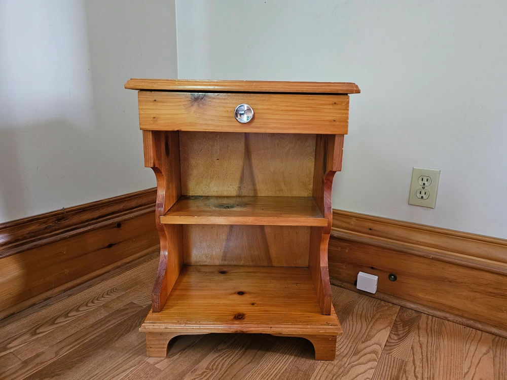 62A charming pine bedside table, perfect for adding a touch of rustic warmth to your bedroom! It features a handy drawer for storing your nighttime essentials and two open shelves for books or decor. The wood grain is lovely and the table is in good condition.