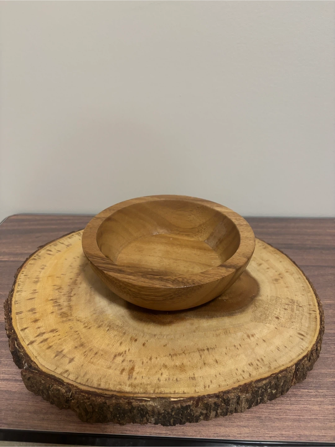 Selling a wooden bowl attached to a round wood slab. They are in good condition and would be great for decor or use in the kitchen.
