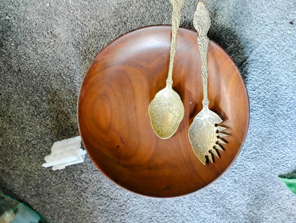 Selling a lovely wooden bowl with a set of brass salad servers. The bowl has a rich, warm tone, and the servers feature a beautiful floral design. Perfect for adding a touch of elegance to your dining table!