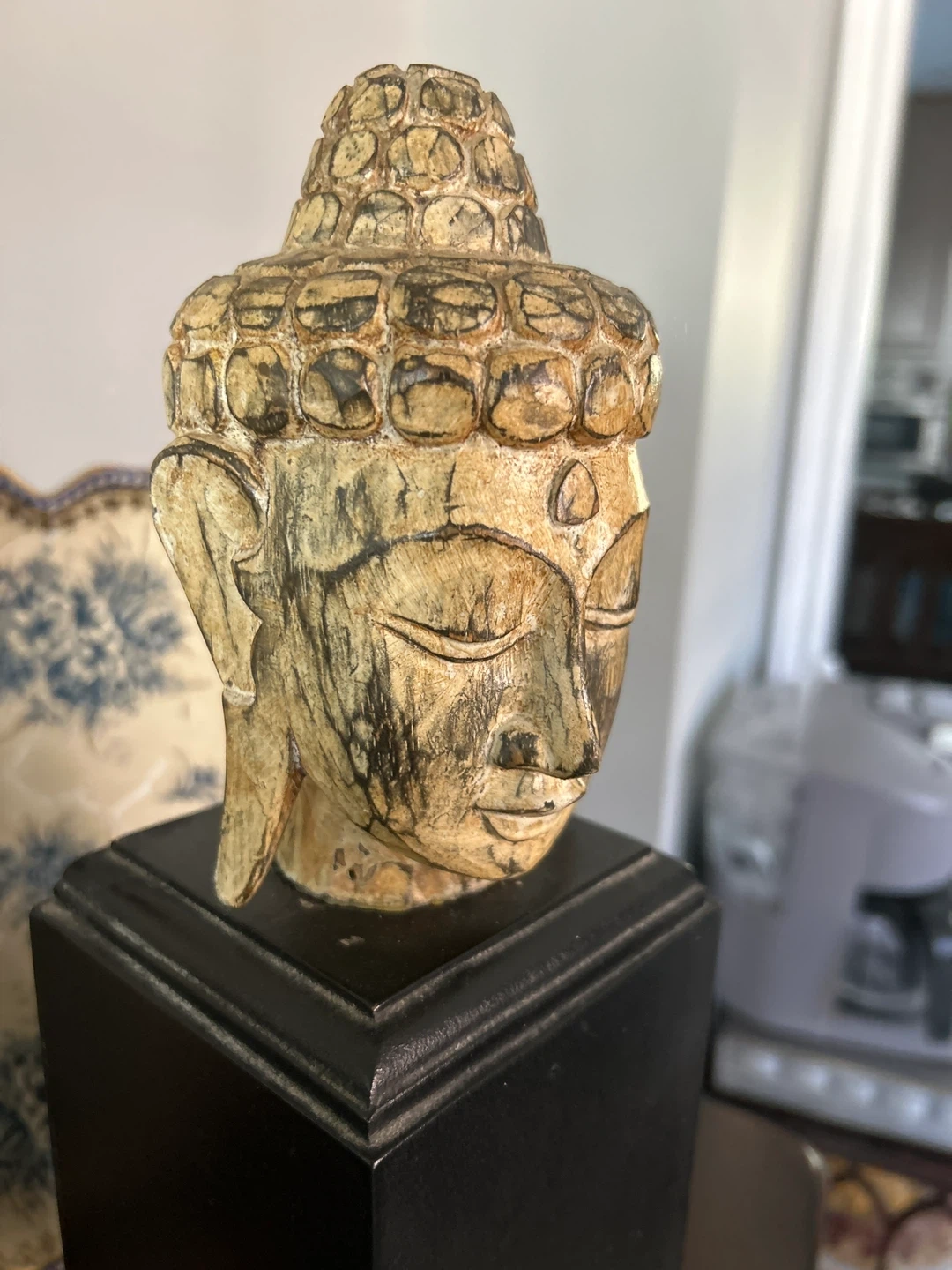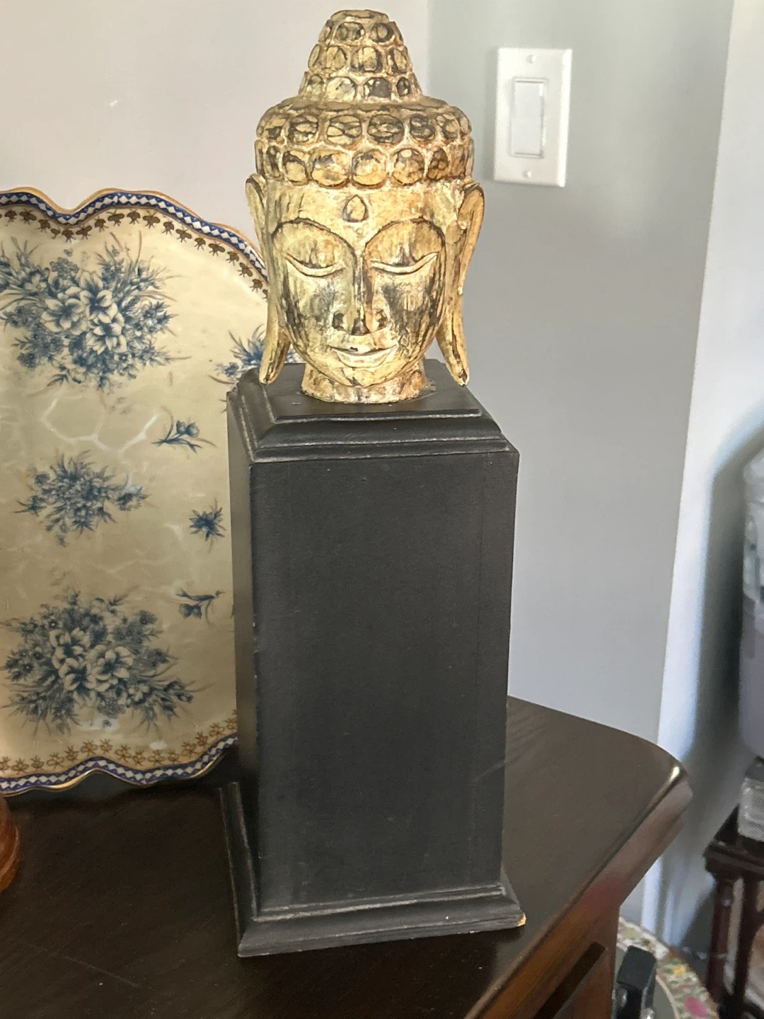 23Selling a Vintage Buddha head statue mounted on a black stand. It's a nice decorative piece for any room. The statue has a unique, textured finish