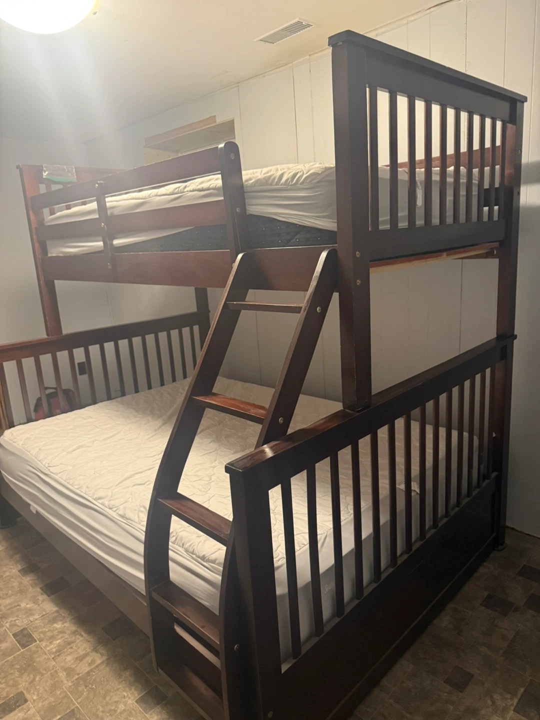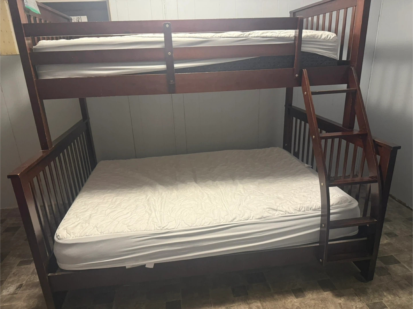 41Selling a wooden bunk bed frame. It's in good condition and ready for a new home. Perfect for kids' rooms or guest rooms! Mattress’s included, if you’d like. The double mattress is almost brand new from Costco and the twin mattress is old. Please email or text. Pick up in North Kildonan. From a dog loving home.