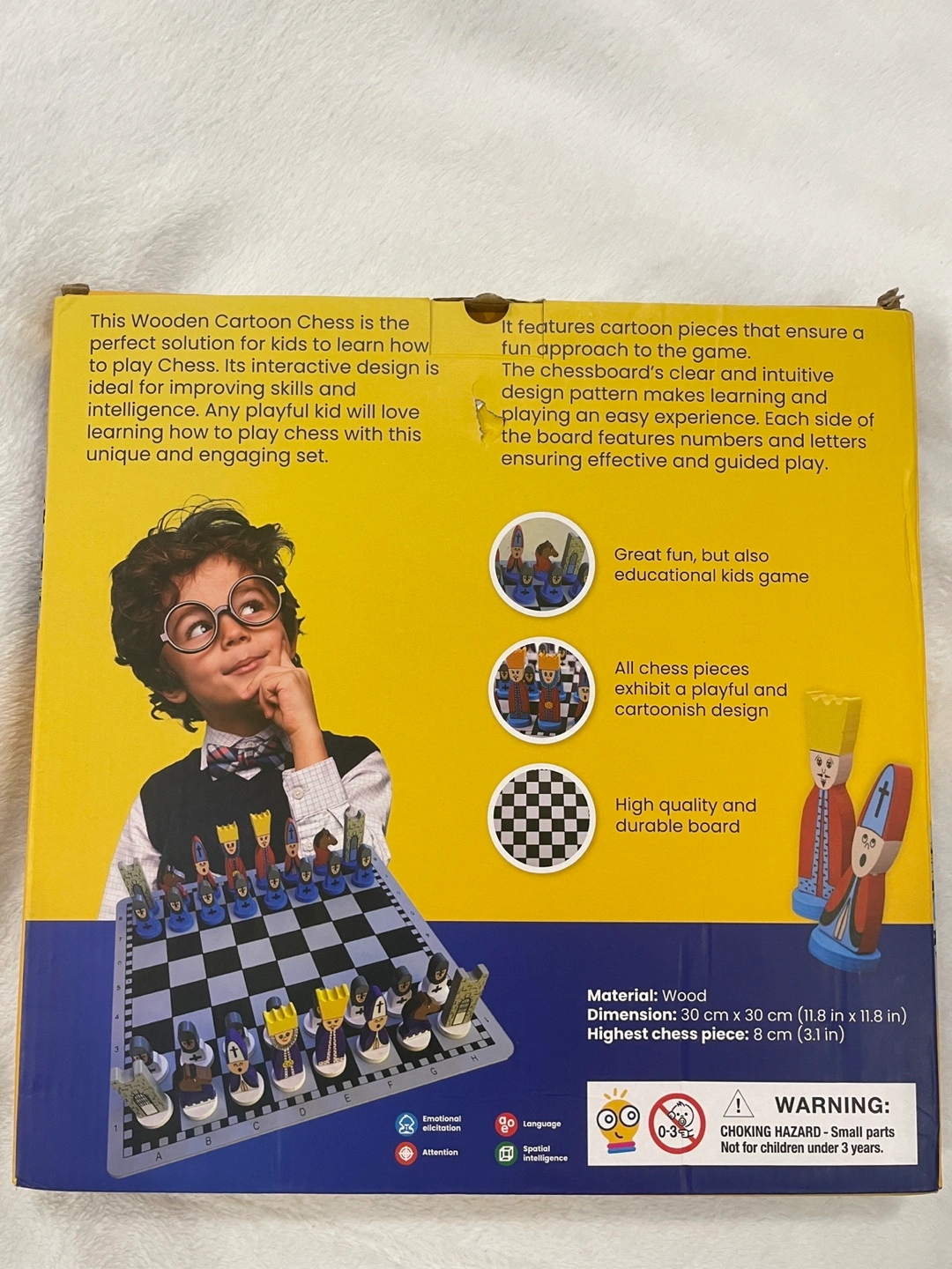 Educational kids game. Features cartoon chess pieces. High-quality wooden board. Great fun and educational. Dimensions: 30 cm x 30 cm (11.8 in x 11.8 in). Ages 6+