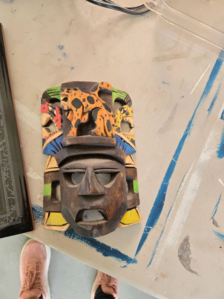 Selling a wooden carved mask. It has a unique design with a jaguar on top and colourful accents. It would make a great addition to any collection or as a decorative piece for your home