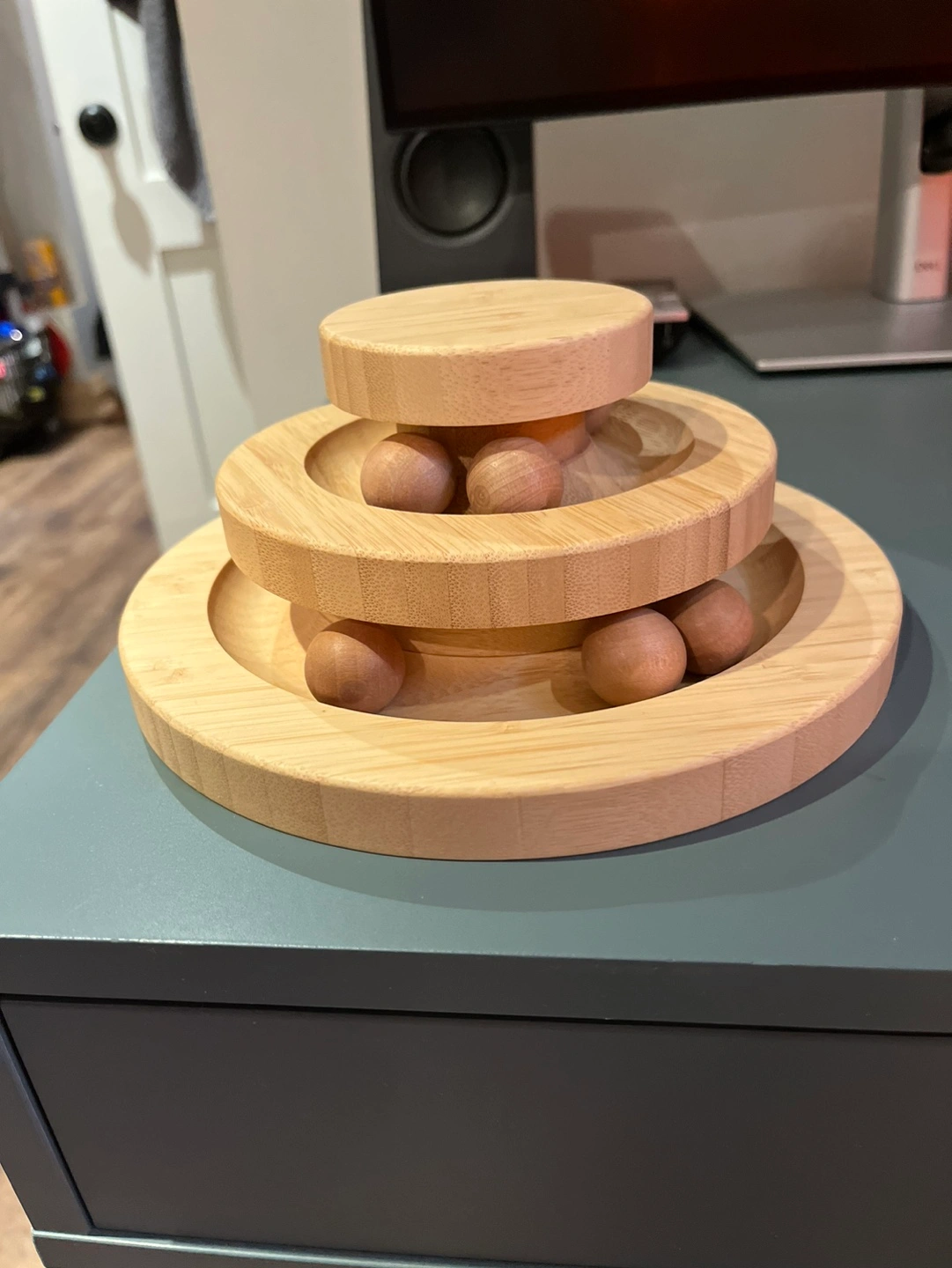 Three-tiered wooden cat toy with rolling balls. Good condition.