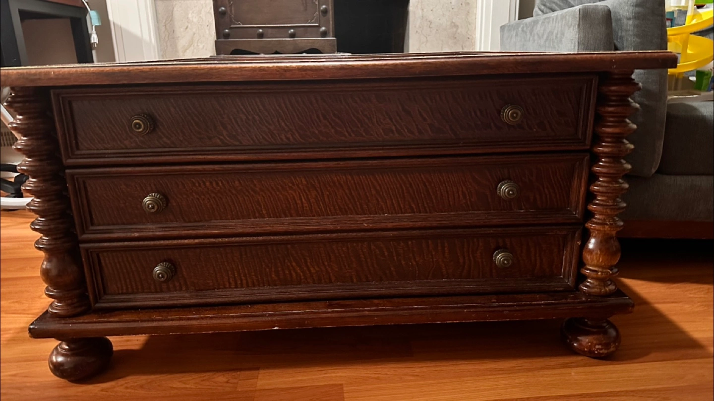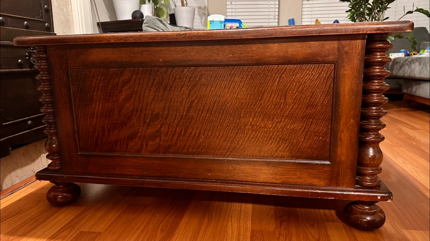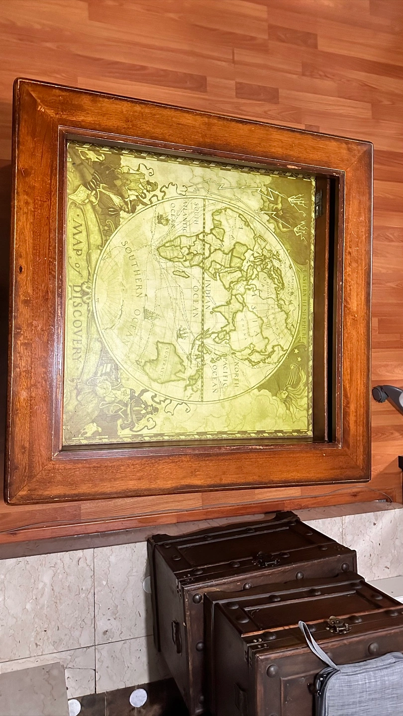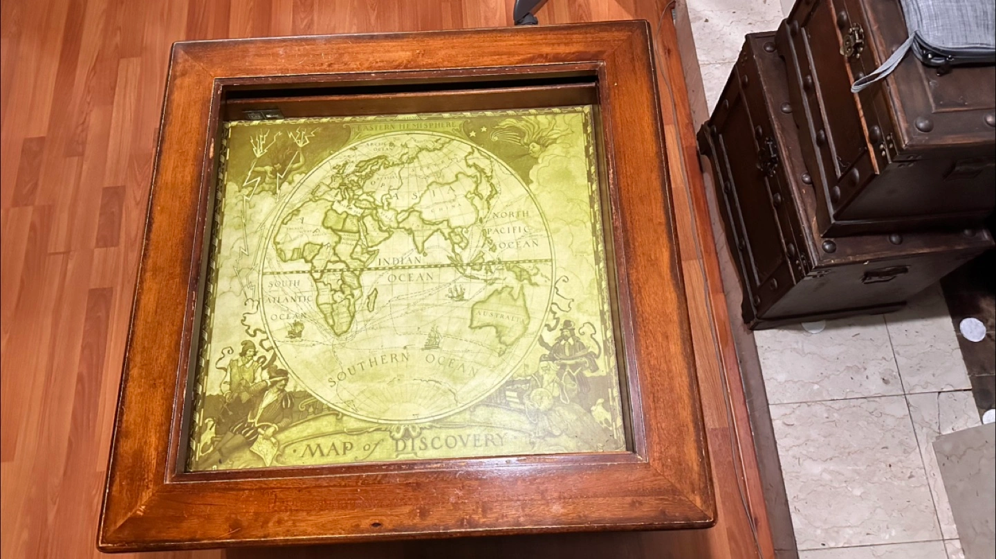 5Here's a unique piece! It's a wooden chest that can also be used as a coffee table. The top features a decorative world map design under glass. It has a nice, rustic look with some wear and tear on the legs, as you can see in the photos. It could be a great addition to your living room or den! It’s missing the top glass piece