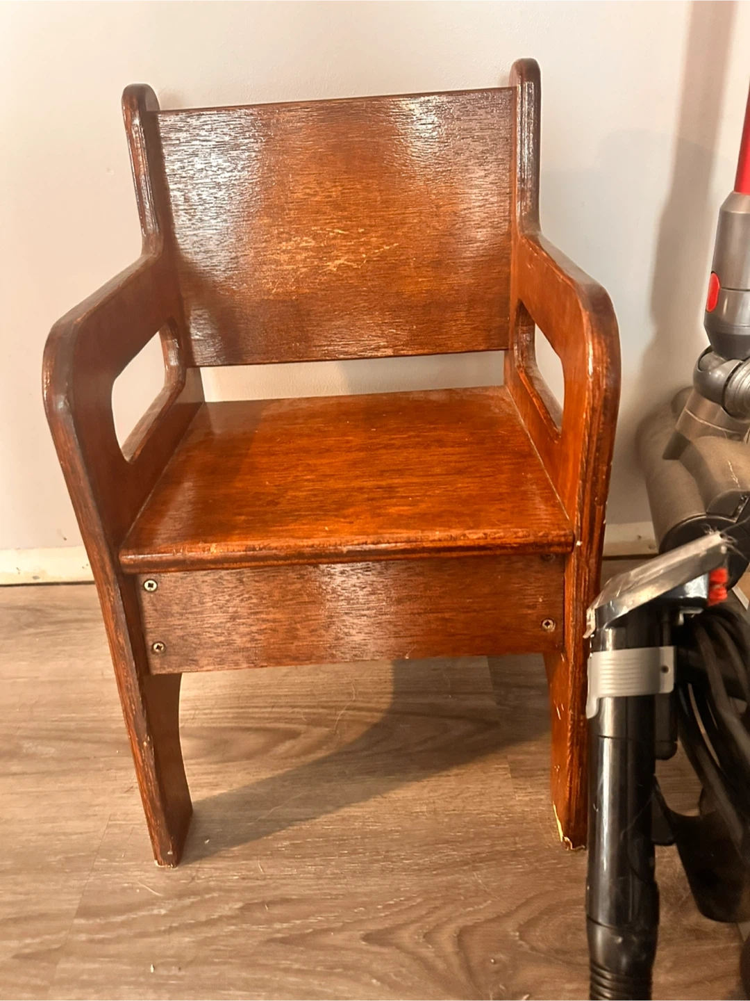 Here's a cute wooden chair perfect for a little one! It's sturdy and has a lovely warm wood tone. It could be used as a step stool or a small seat for a toddler.