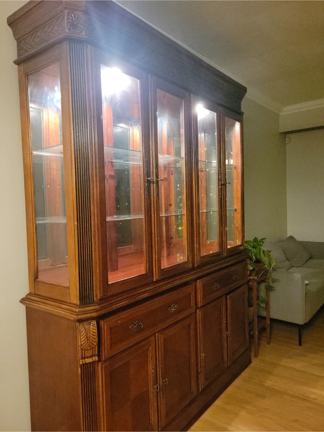 60Selling a beautiful wooden china cabinet. It features glass doors on the upper section and wooden doors on the lower part, offering plenty of storage and display space for your dining room or living area