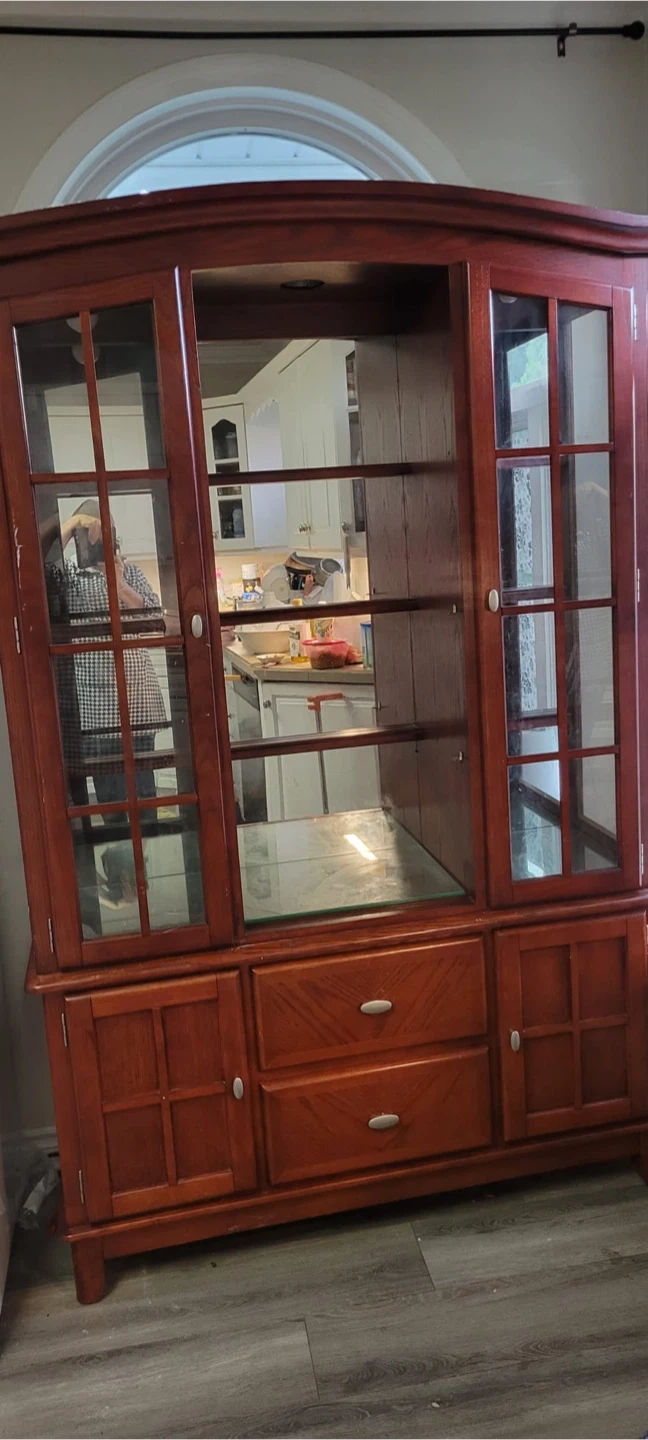 60A beautiful wooden china cabinet, perfect for displaying your cherished items or storing dining essentials. It features glass shelves and drawers for storage. The warm wood tone adds a touch of elegance to any dining space