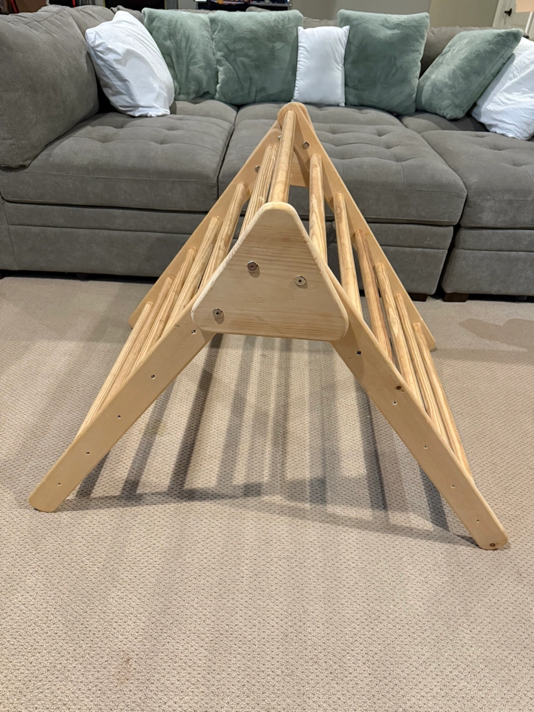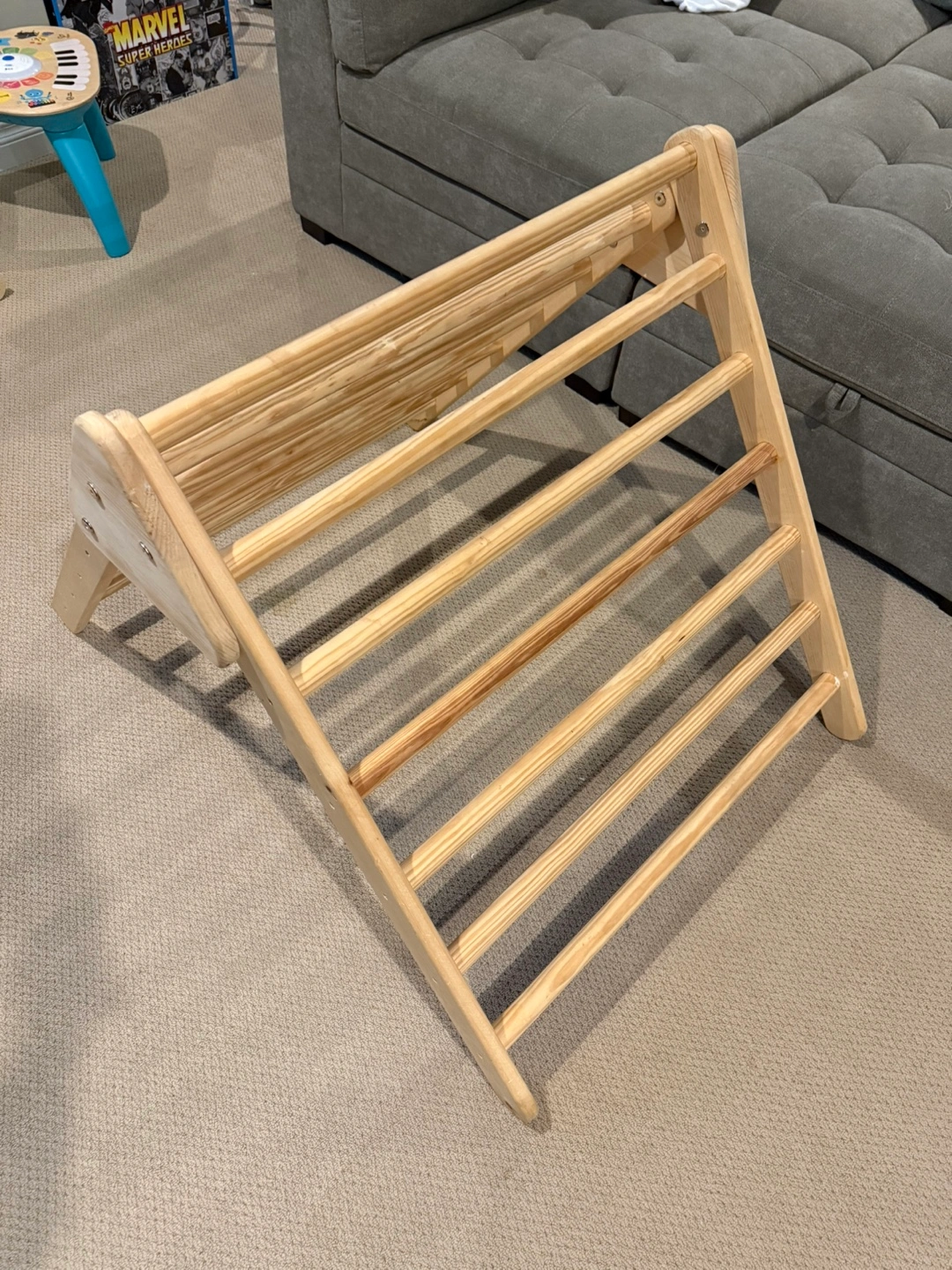 Here's a wooden climbing triangle, perfect for active kids! It's in great shape and ready for a new home. This climbing structure encourages physical activity and helps develop motor skills. It's a fun and safe way for kids to explore and play indoors!
