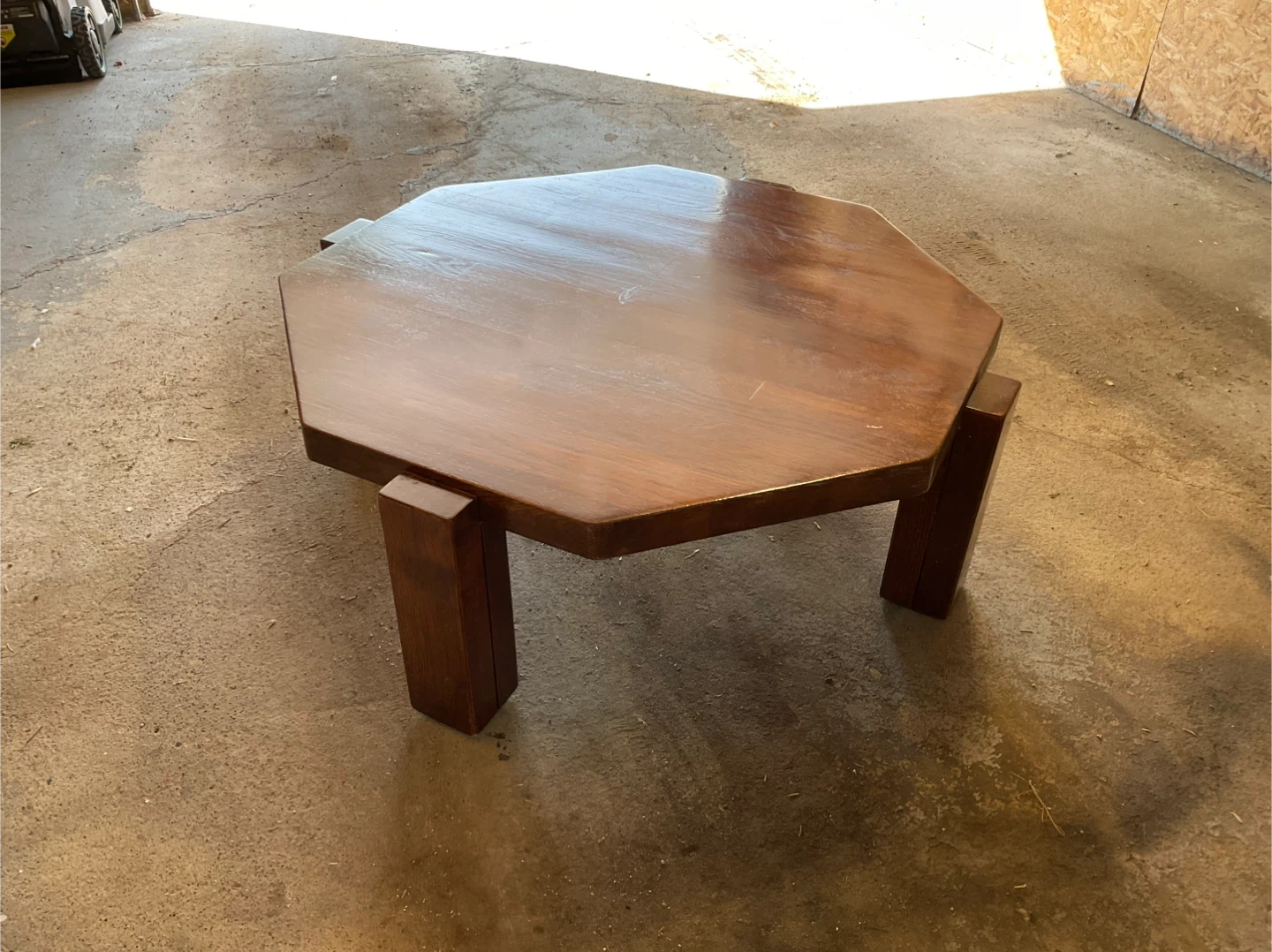 10A beautiful wooden coffee table ready for a new home! It has a unique octagonal shape and sturdy leg design. It would be a great addition to any living room or den