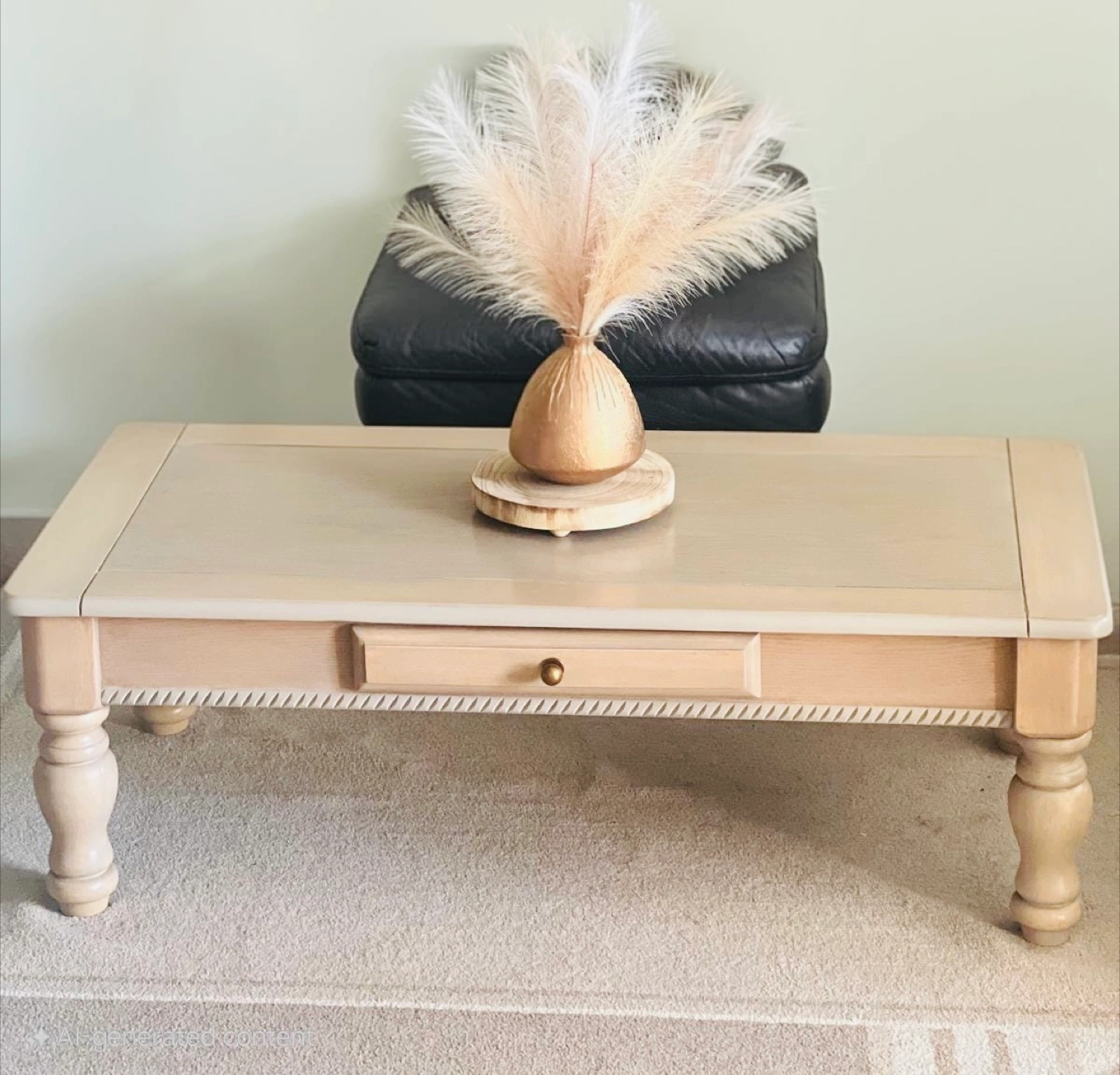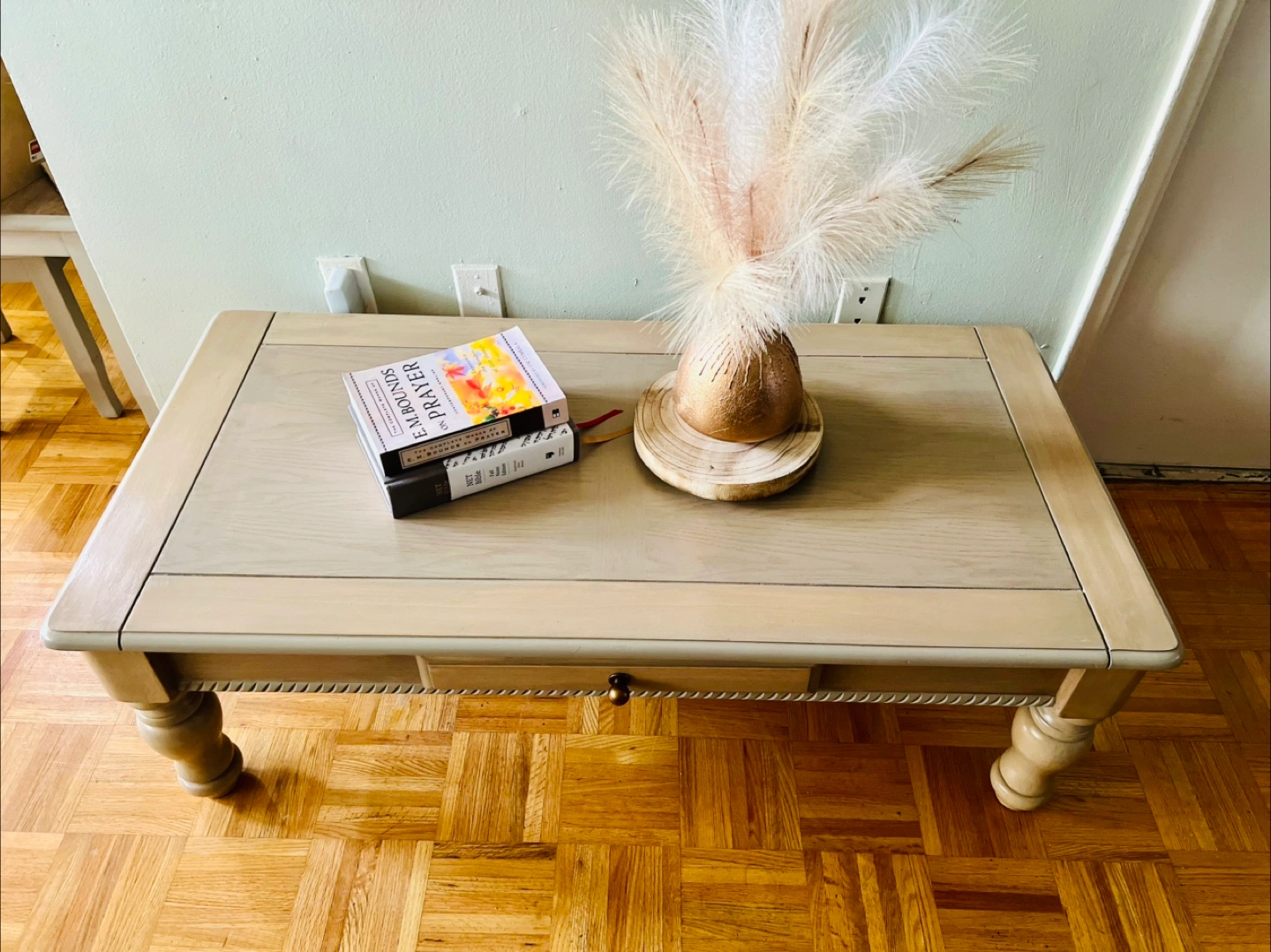 A lovely natural wood coffee table with a beautiful wood grain, perfect for any living room! It's in great shape and ready for a new home. Has a drawer for storage with a beautiful brass handle.