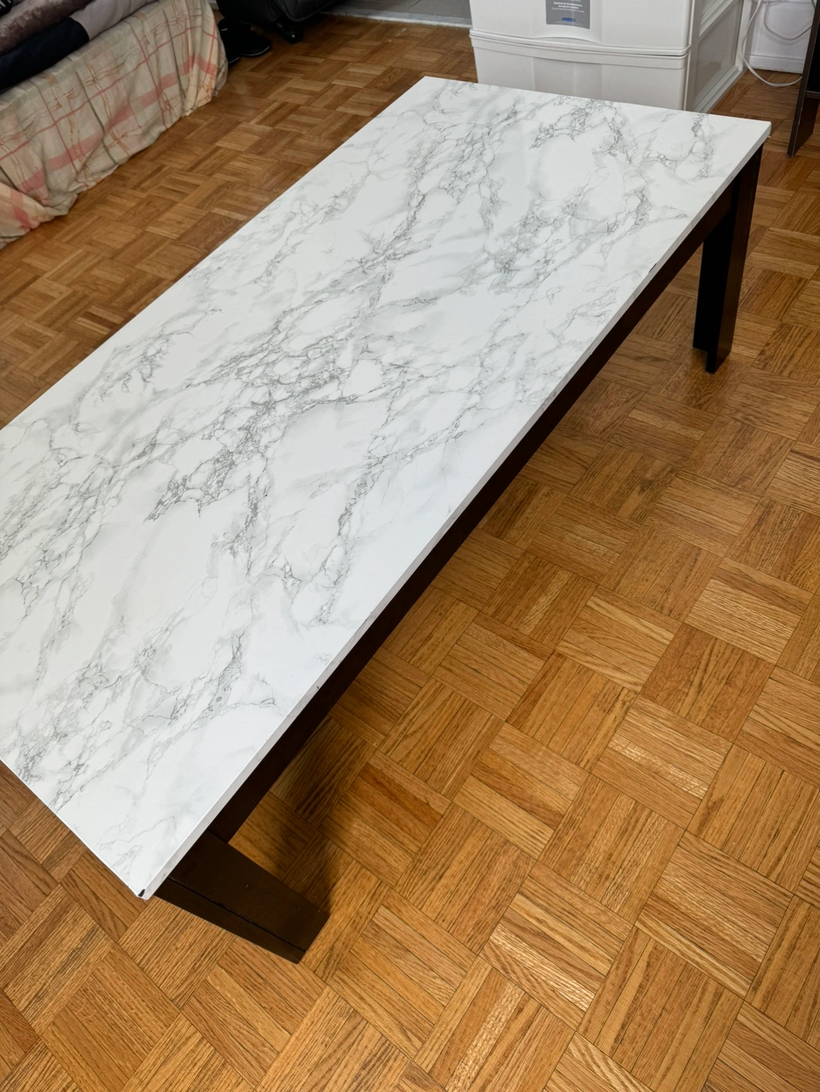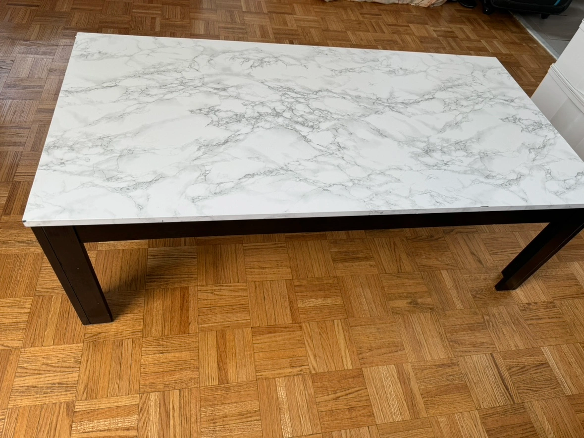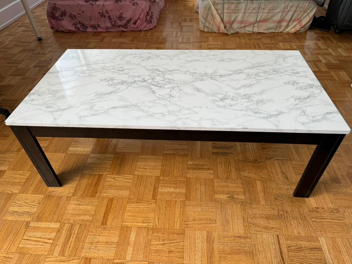 A wooden coffee table with brown detachable legs and a white marble-patterned top. Comes with tool to detach and attach.