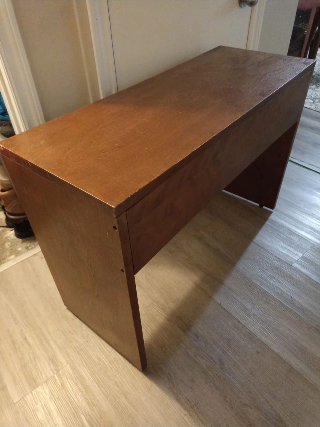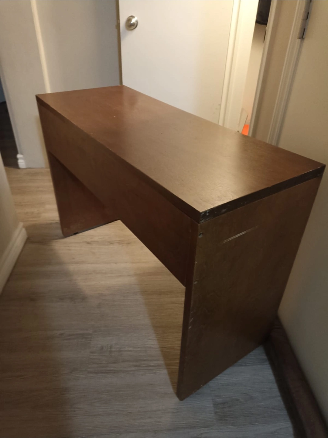 115Wooden console table in a brown finish. It's a rectangular shape, with a flat surface and sturdy legs. Perfect for storing items or displaying decorations to create a calm space. Length x with x height