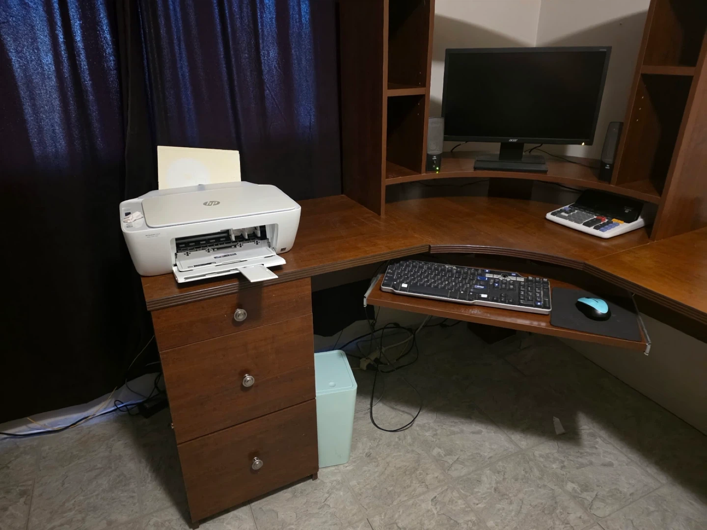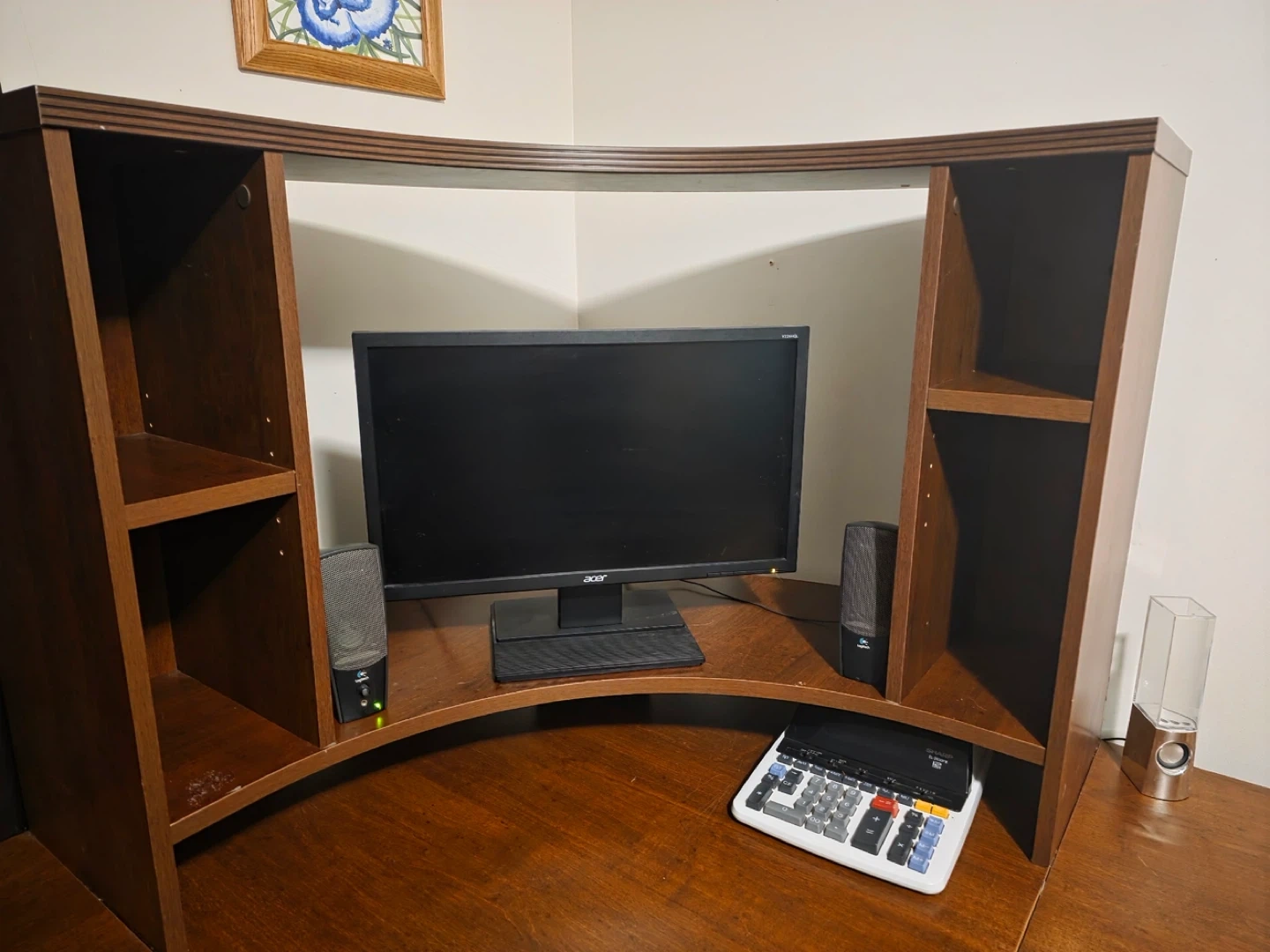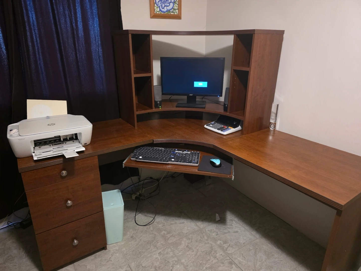10Selling a wooden corner desk with a hutch. It's in good condition and has plenty of storage space. Perfect for a home office or study area!