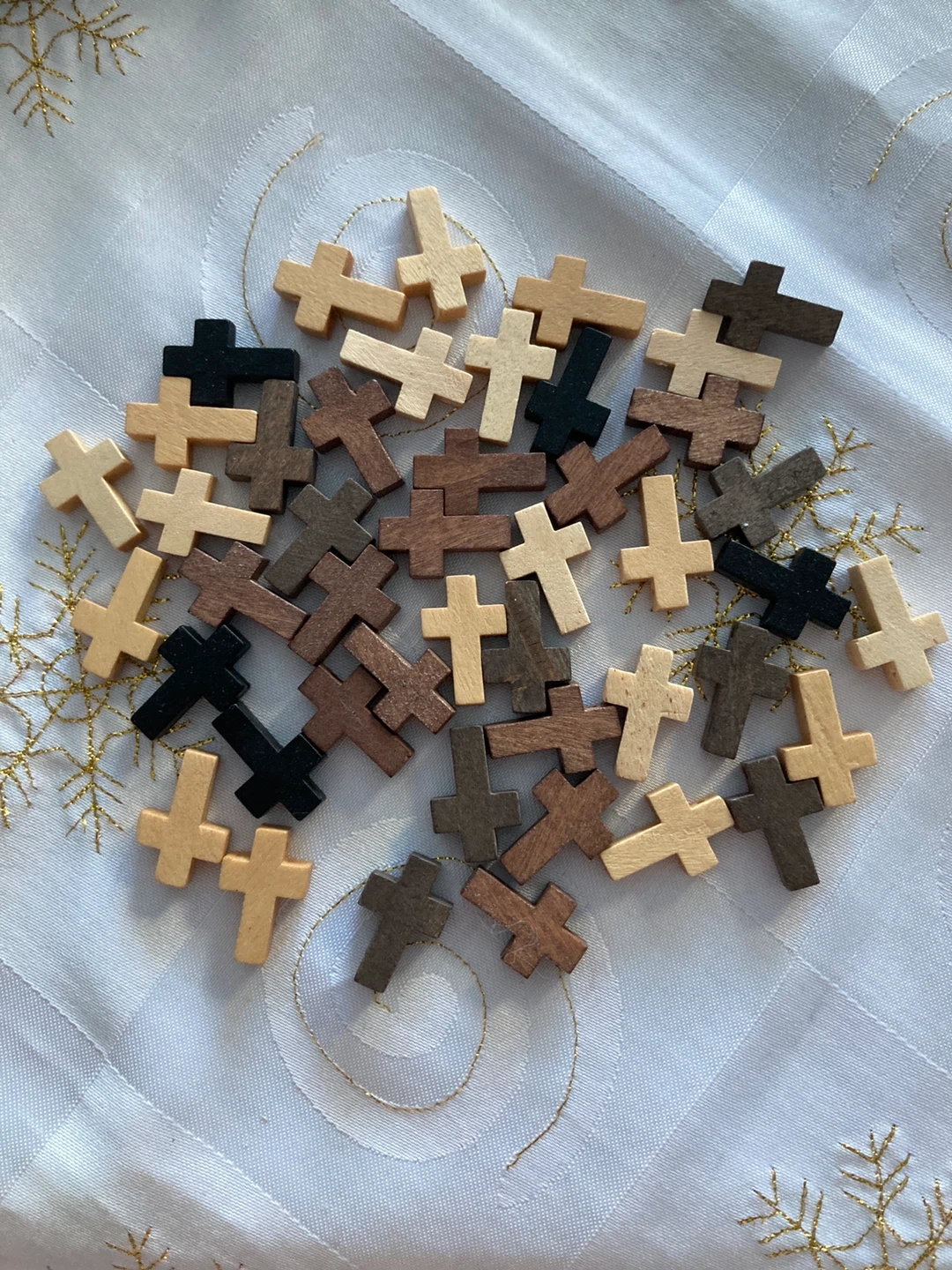186A collection of wooden crosses in various colours. These are perfect for crafts, decorations, or religious purposes. They come in a mix of light, medium, and dark wood tones. Get creative with these versatile little crosses