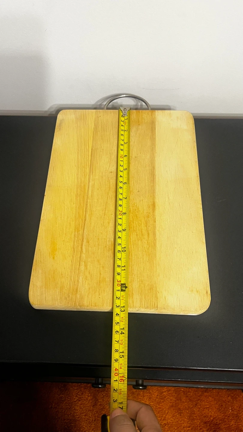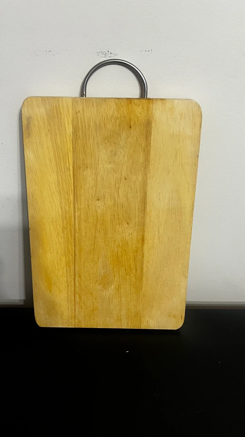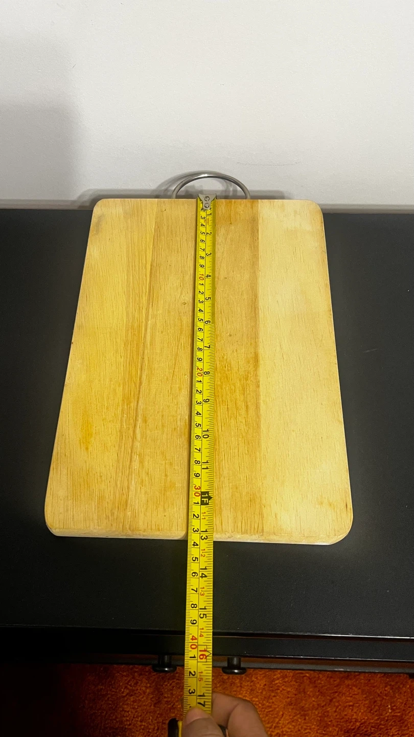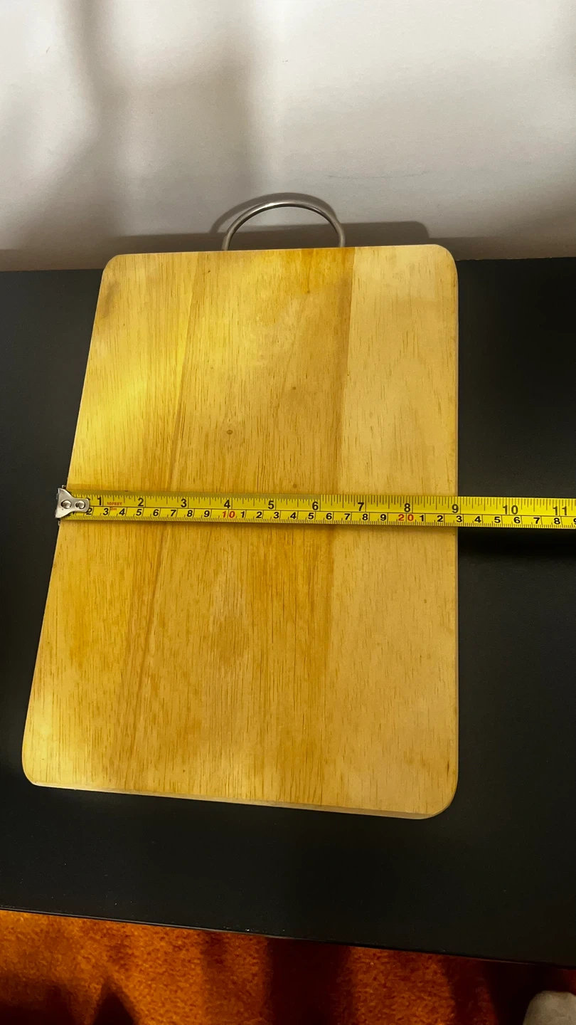 10Selling a wooden cutting board that's in good condition. Barely used It has a convenient metal handle for easy storage or carrying. The board measures approximately 16 inches in length and 9 inches in width.