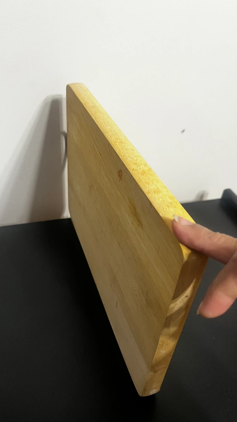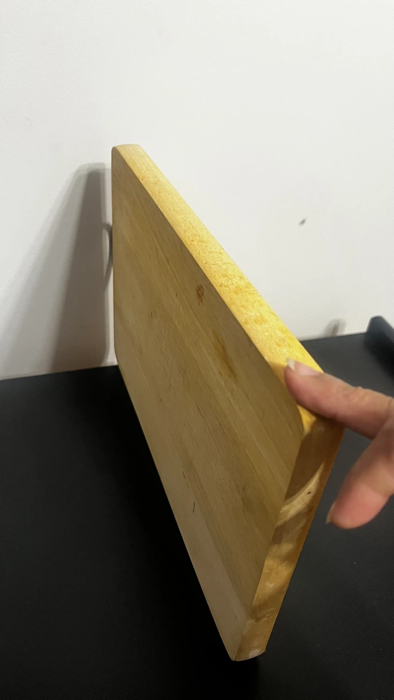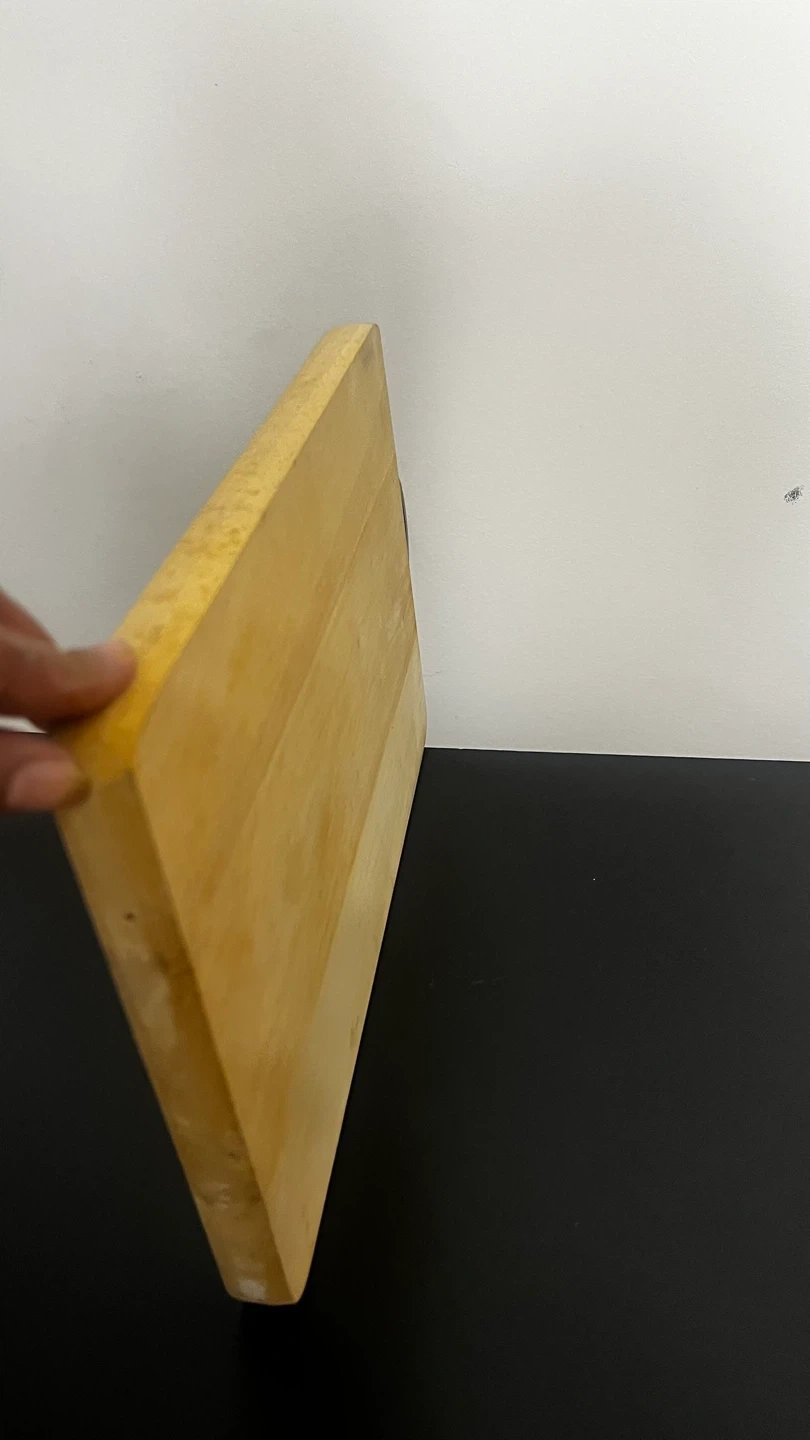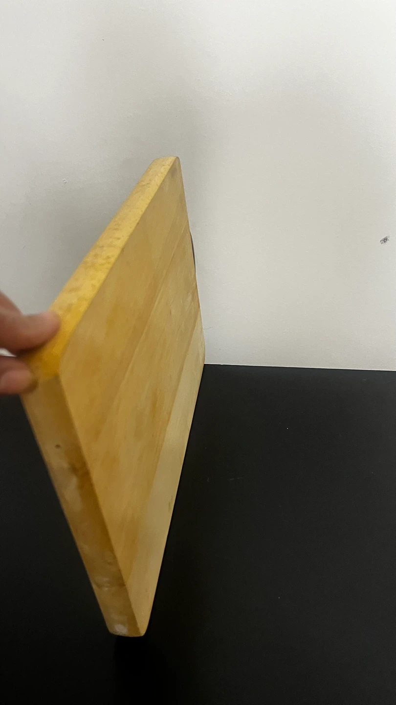 10Selling a wooden cutting board that's in good condition. Barely used It has a convenient metal handle for easy storage or carrying. The board measures approximately 16 inches in length and 9 inches in width.
