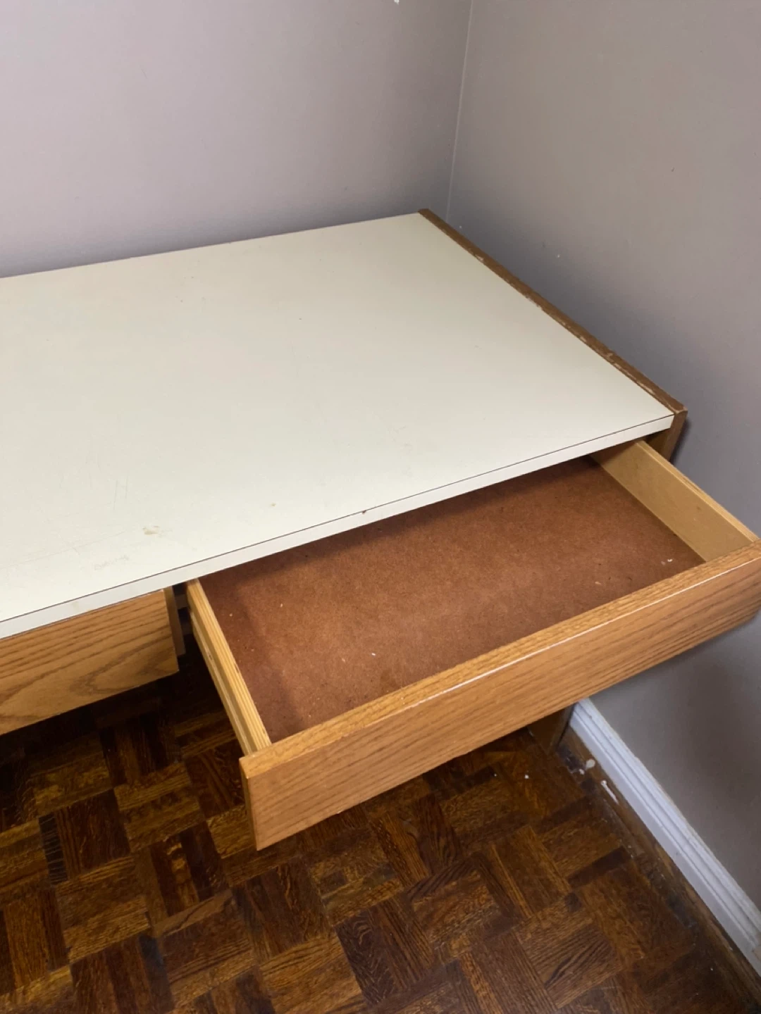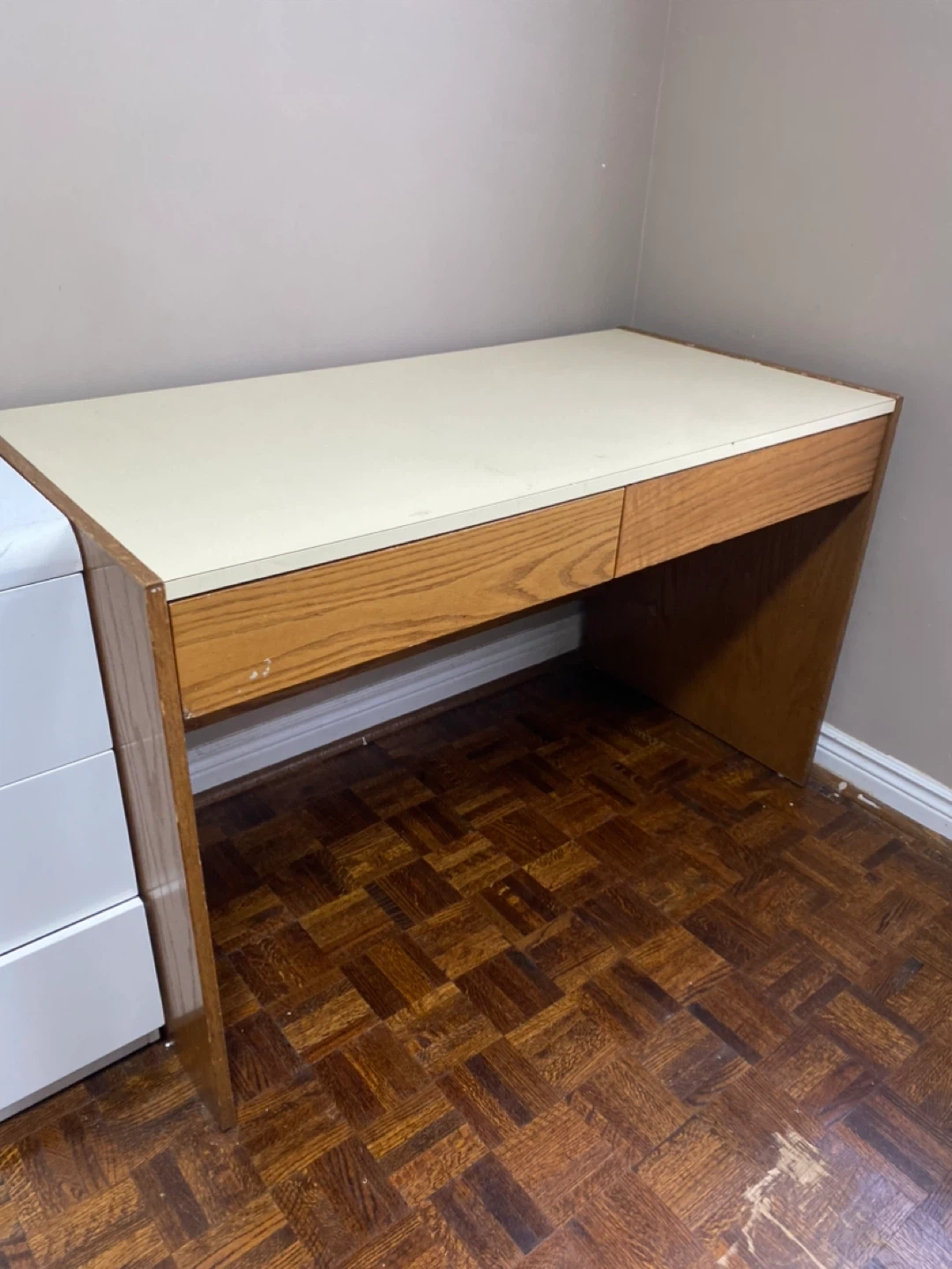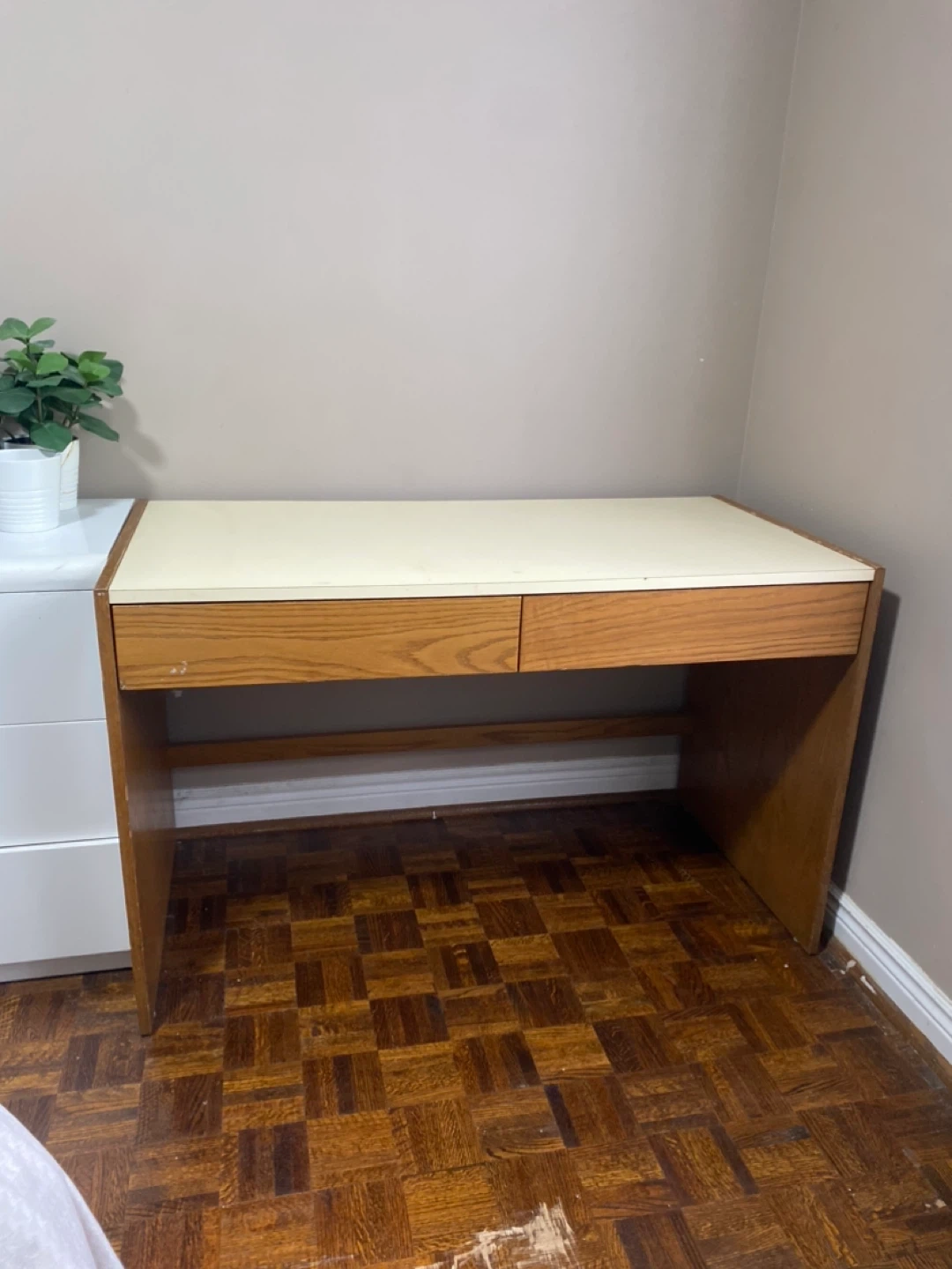 Selling a sturdy wooden desk featuring a cream-coloured top! It measures approximately 48 inches in width and 30 inches in depth. It has a classic look that would fit nicely in a home office or study space. It also has two drawers for storage