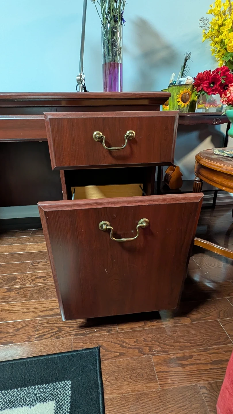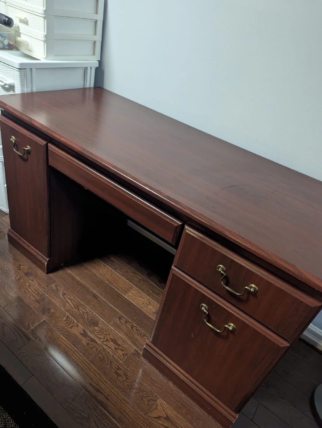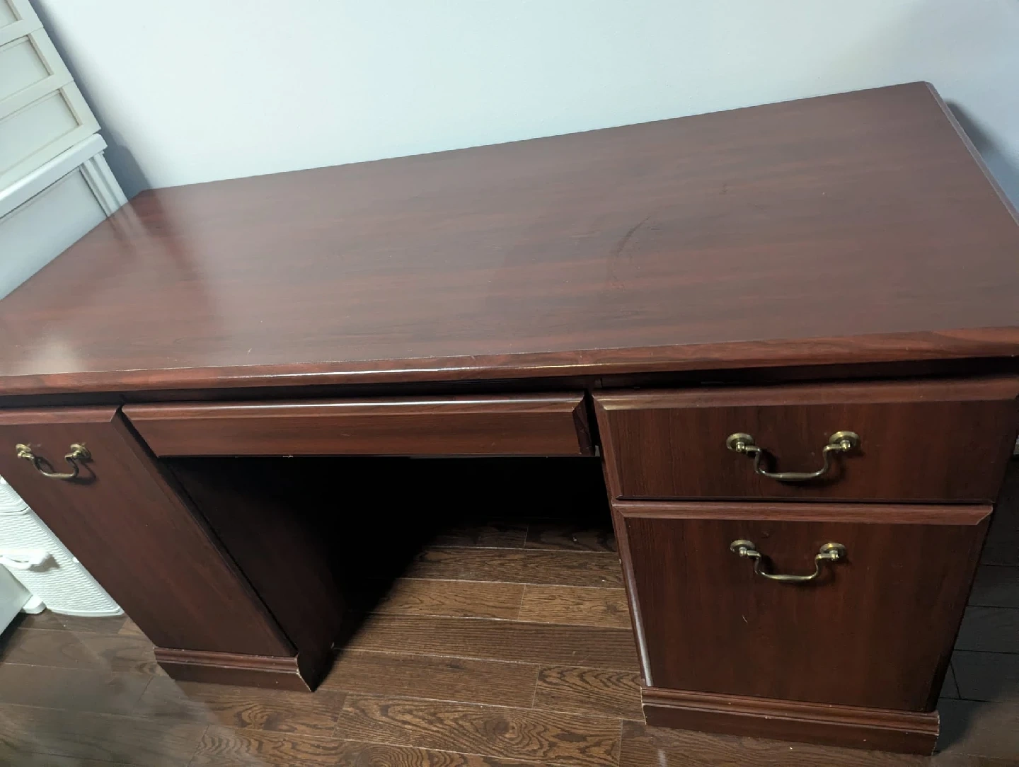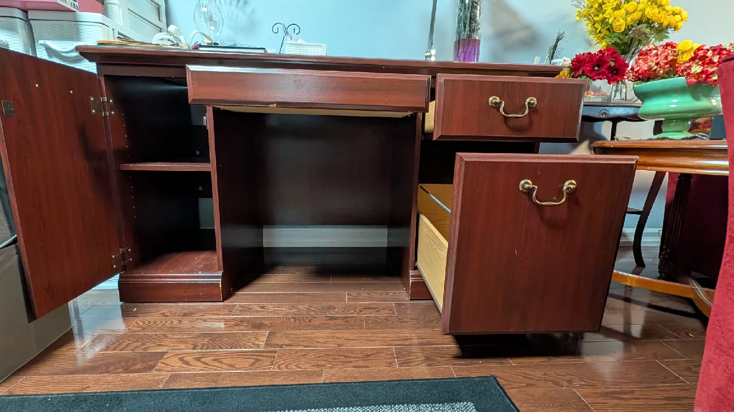 10A sturdy wooden desk with a rich, dark finish. It features drawers on one side and a cabinet with shelves on the other, providing ample storage space. Perfect for a home office or study area!