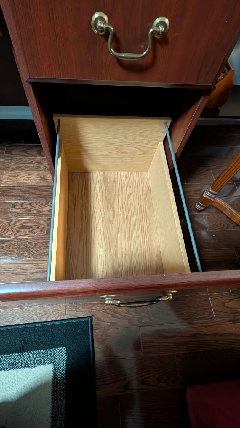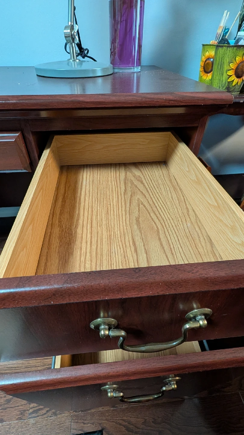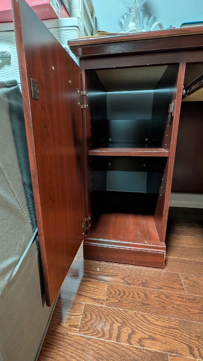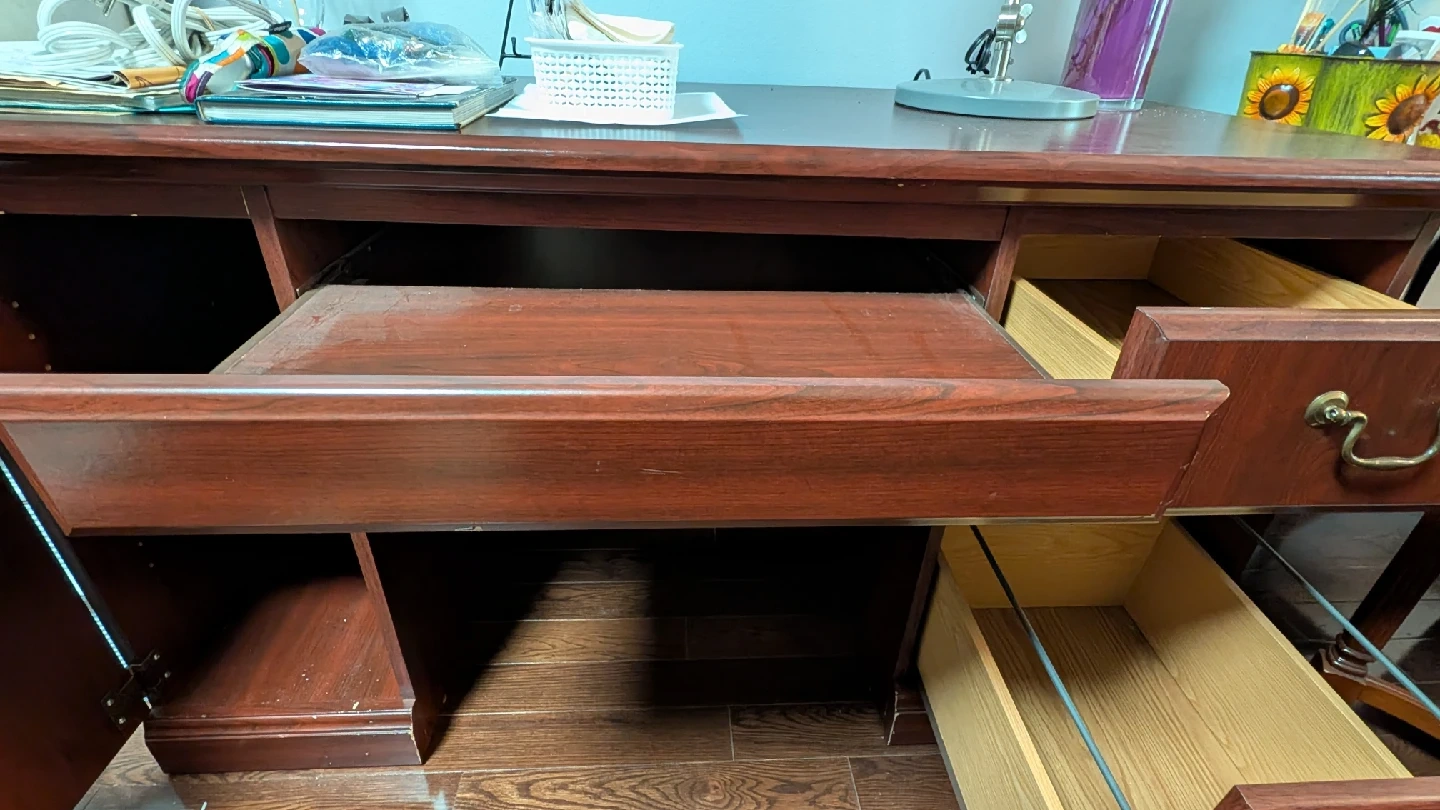 10A sturdy wooden desk with a rich, dark finish. It features drawers on one side and a cabinet with shelves on the other, providing ample storage space. Perfect for a home office or study area!