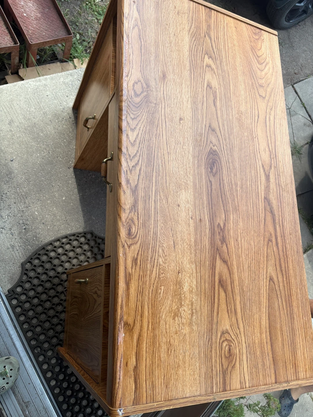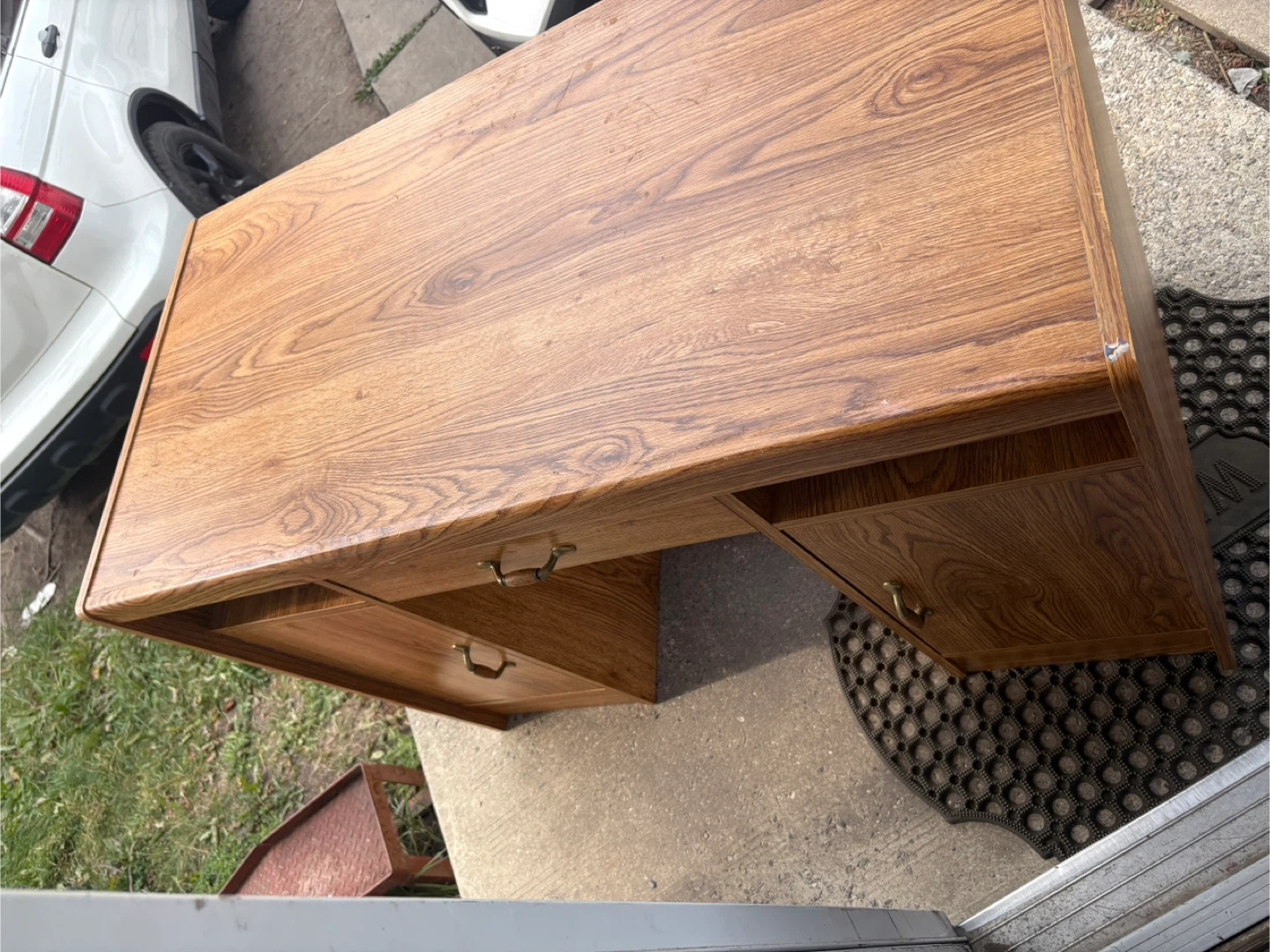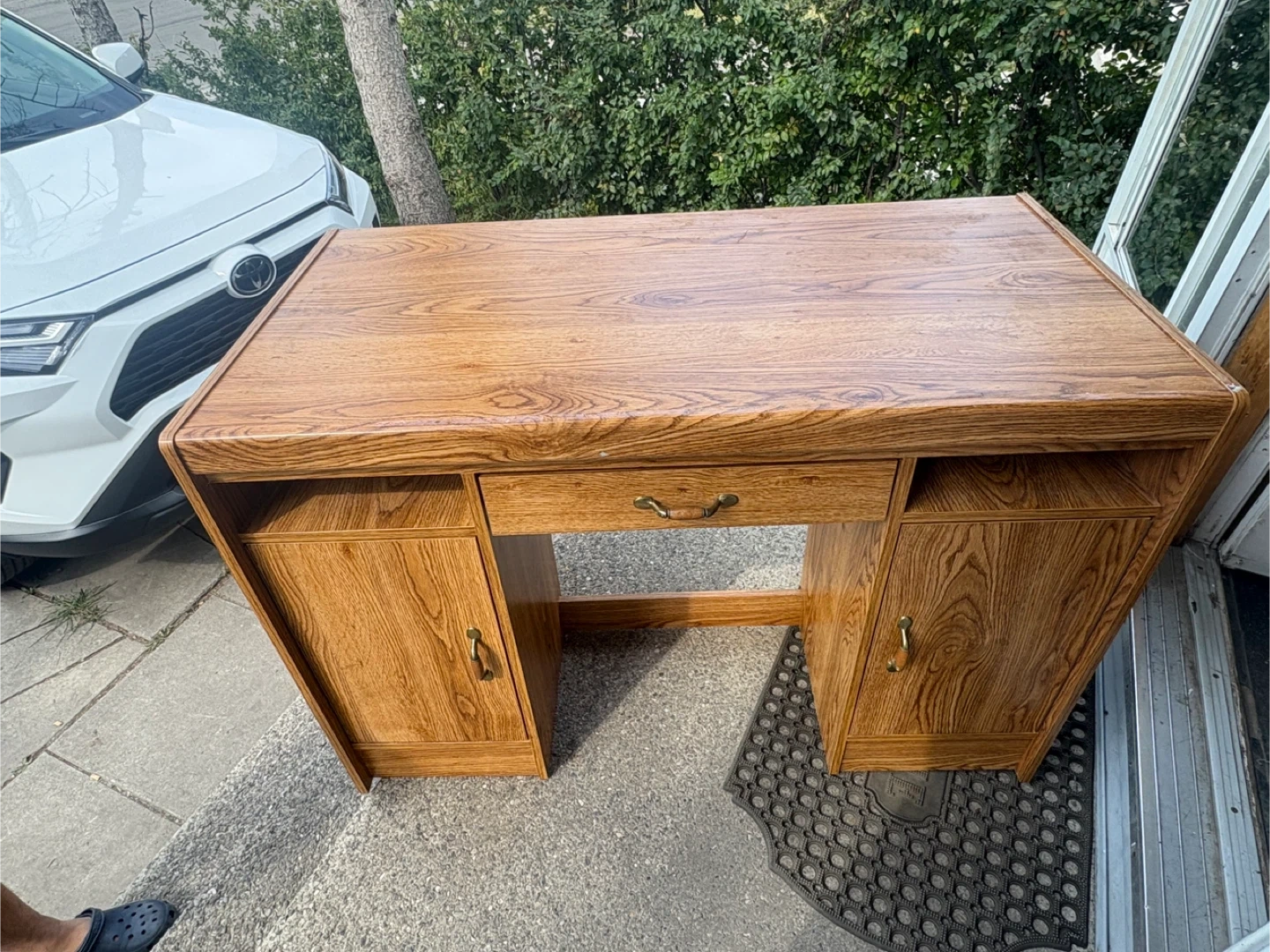 Here's a sturdy wooden desk with a classic design! It features a central drawer and cabinets on either side, providing ample storage space. It's perfect for a home office or study area. The desk shows some signs of use, but is still in good condition and ready for a new home