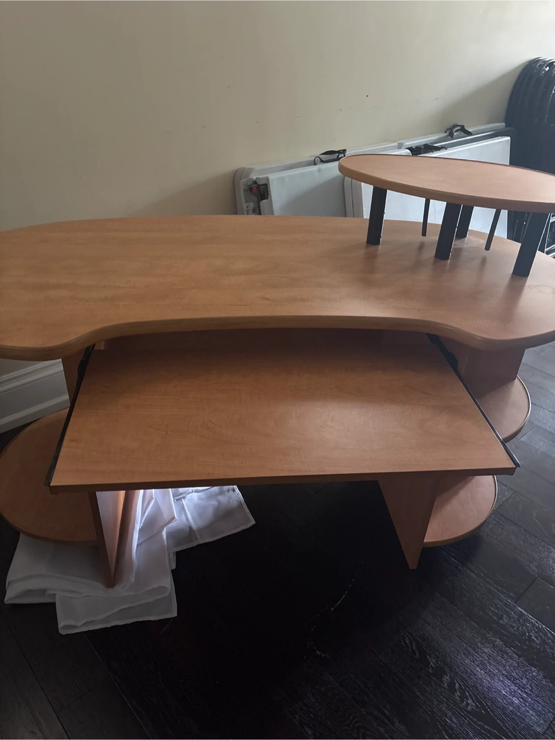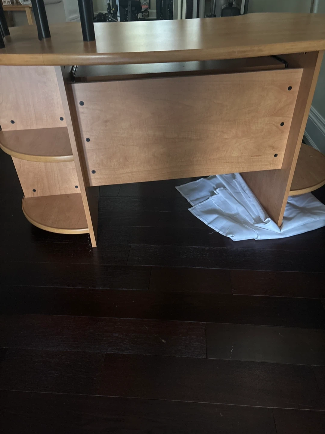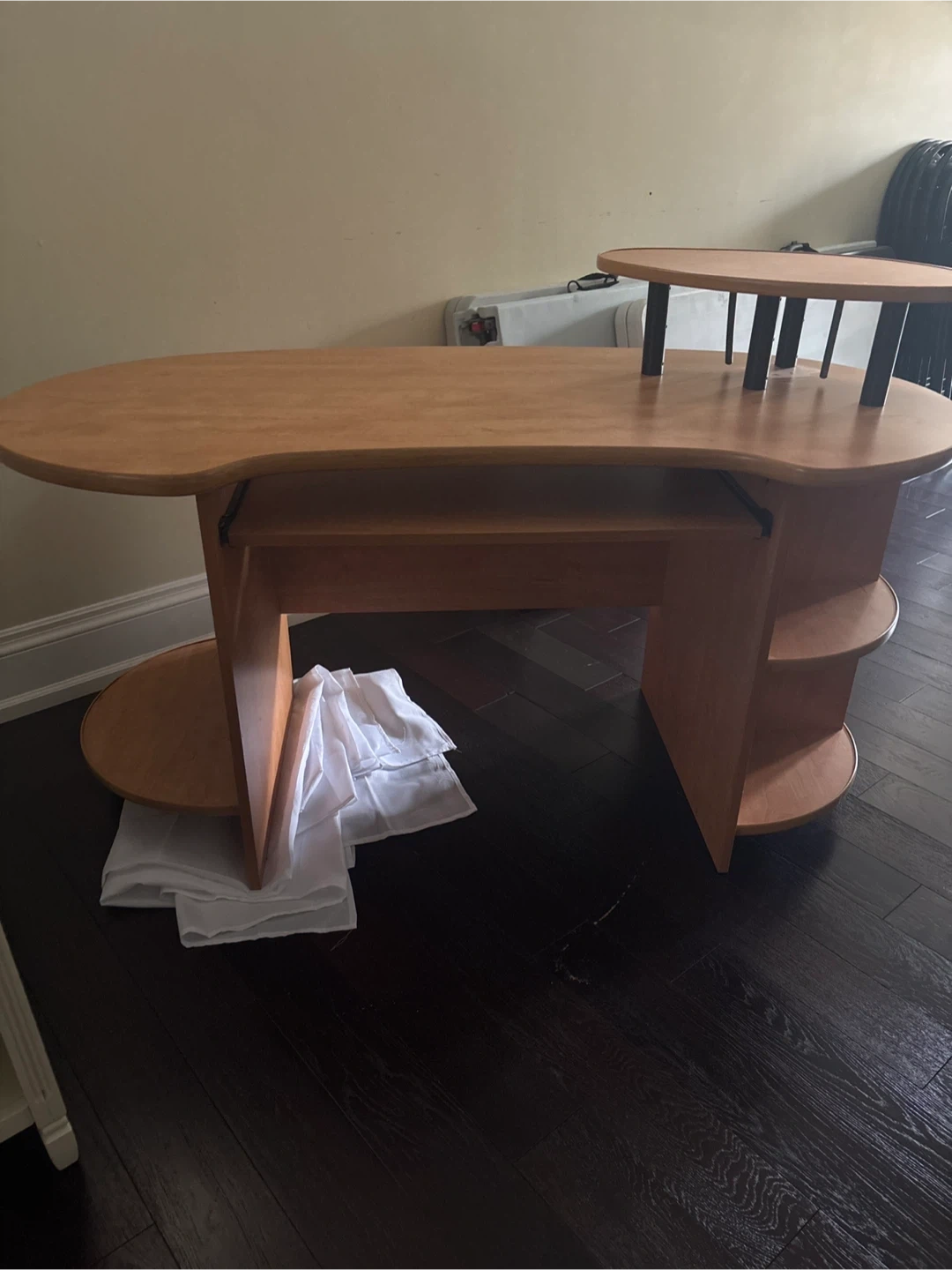 20Selling a wooden desk with unique shelving! It's a sturdy piece of furniture that would be great for a home office or study space. The desk features a pull-out keyboard tray and additional shelving on the sides, providing ample storage. It's in good condition and ready for a new home!