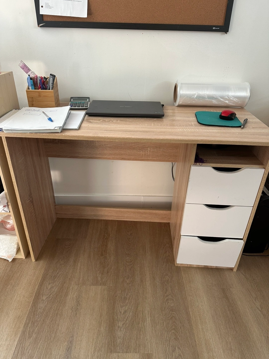 Selling a desk with a light wooden top and white drawers on one side. It's in good condition and perfect for a home office or study space! The desk has a clean, simple design that would fit well in any room. One drawer needs a little fixing.