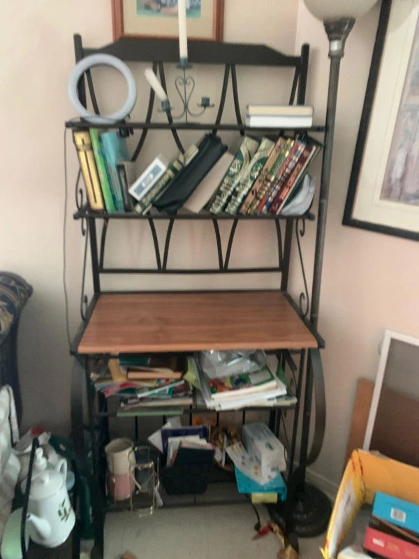 Selling a wooden desk with a wooden shelf. It's in good condition and perfect for adding storage and display space to your kitchen or dining area. The rack has multiple shelves for storing books.