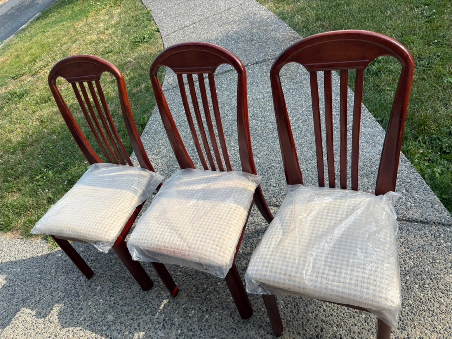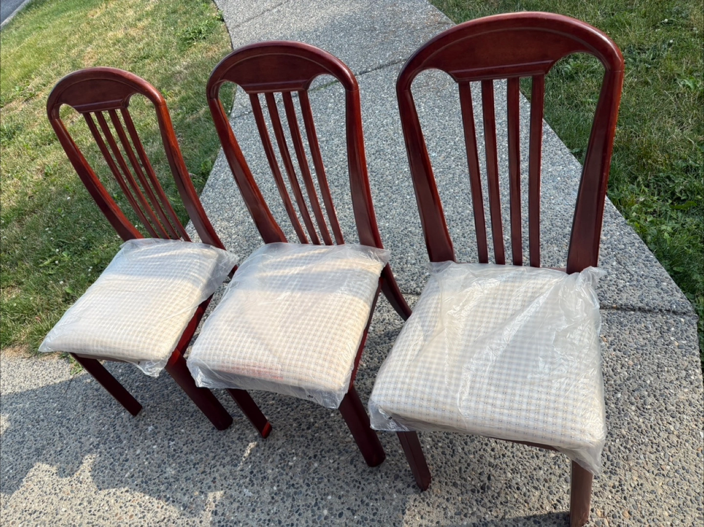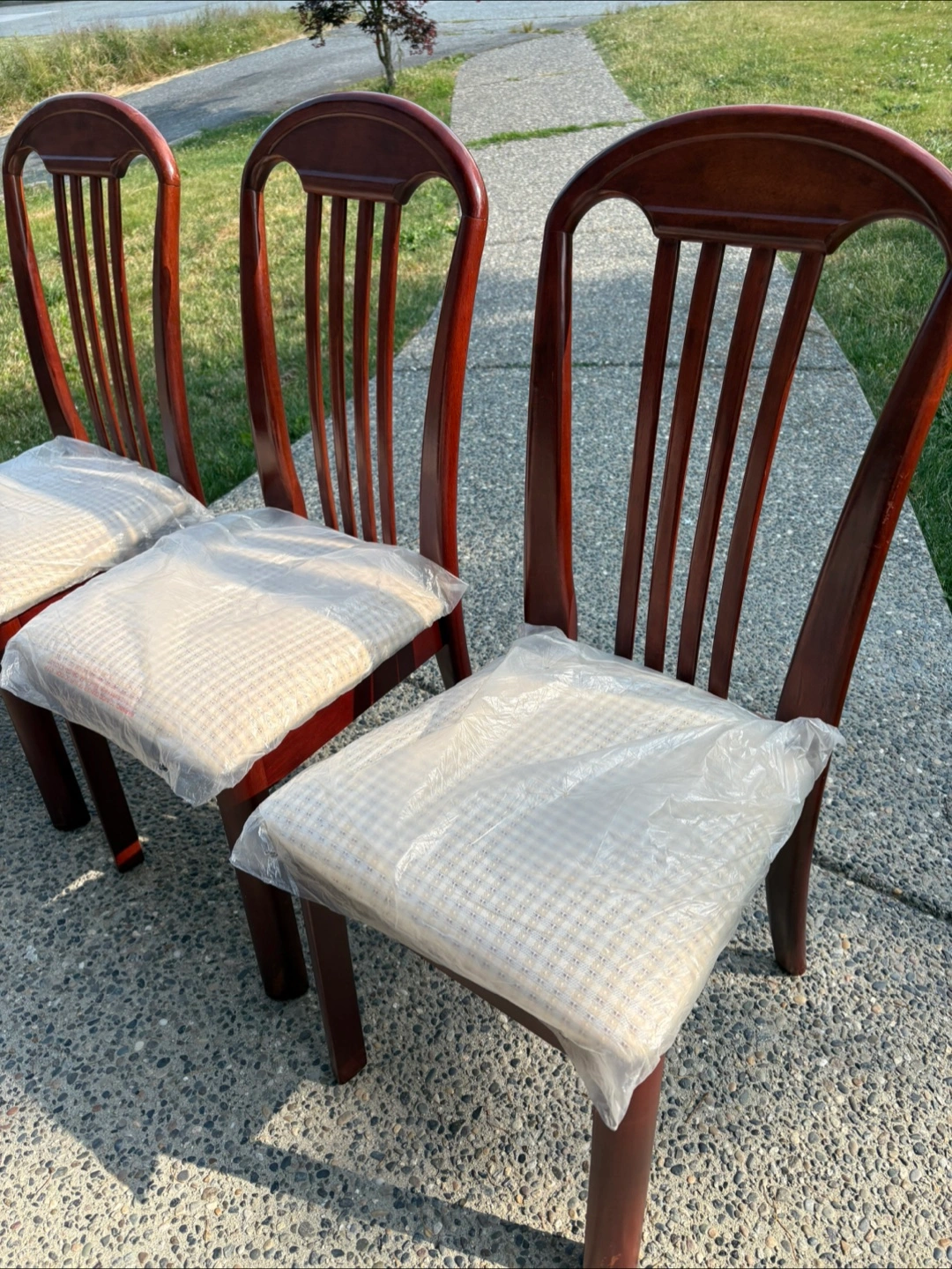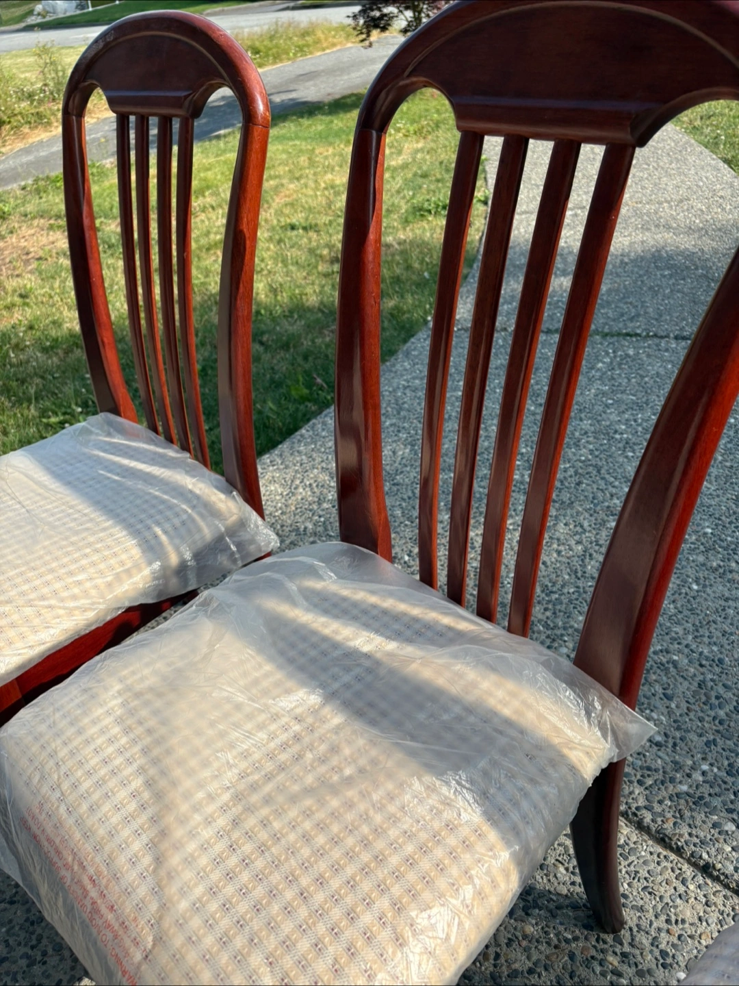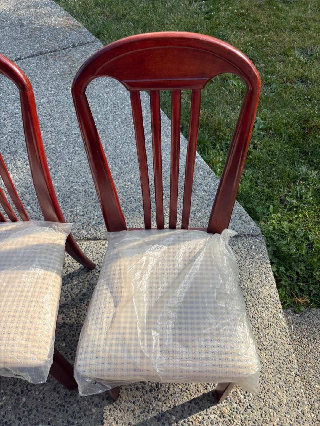 Selling a set of six wooden dining chairs. They have a classic design with a vertical slat back and cushioned seats still in their original plastic covering. Perfect for adding a touch of elegance to your dining area if you would like individual and not all 6 please dm me and we can work out a pricing that works for you!