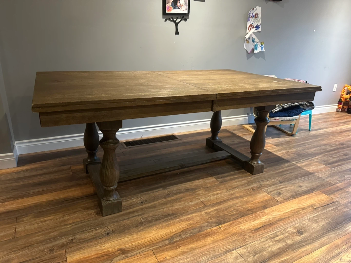 Selling a solid wooden dining table! It's a lovely piece with a classic design. The table shows some signs of use, but it's still sturdy and ready for a new home. Perfect for family dinners or gatherings with friends